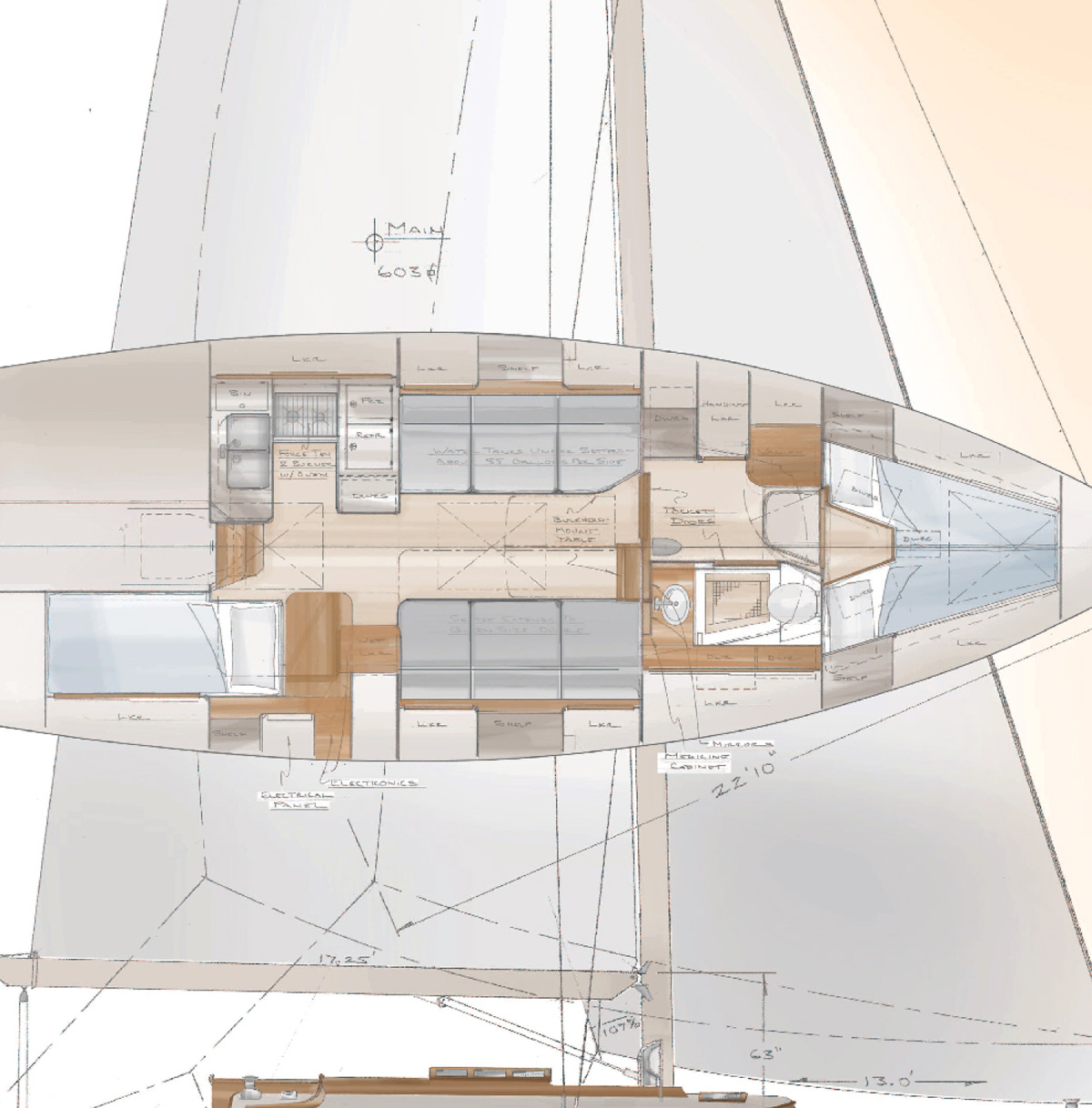 Nymph represents a distinctively different twist on tradition. Her lines feature the plumb stem and broad, shapely transom of yachts and working craft of the late 19th century. In addition to the good looks inherent in this hull, there’s performance—light displacement, long waterline, and a clean, flat run aft spell high speed and good manners. The rig features our latest thinking for fast, easy sailing. Traditional deck joinery offsets the modern cockpit layout, set up for perfect short-handed sailing. Below a roomy arrangement accommodates two couples or a family of up to six. Nymph offers the best of classic style and modern cruising performance.