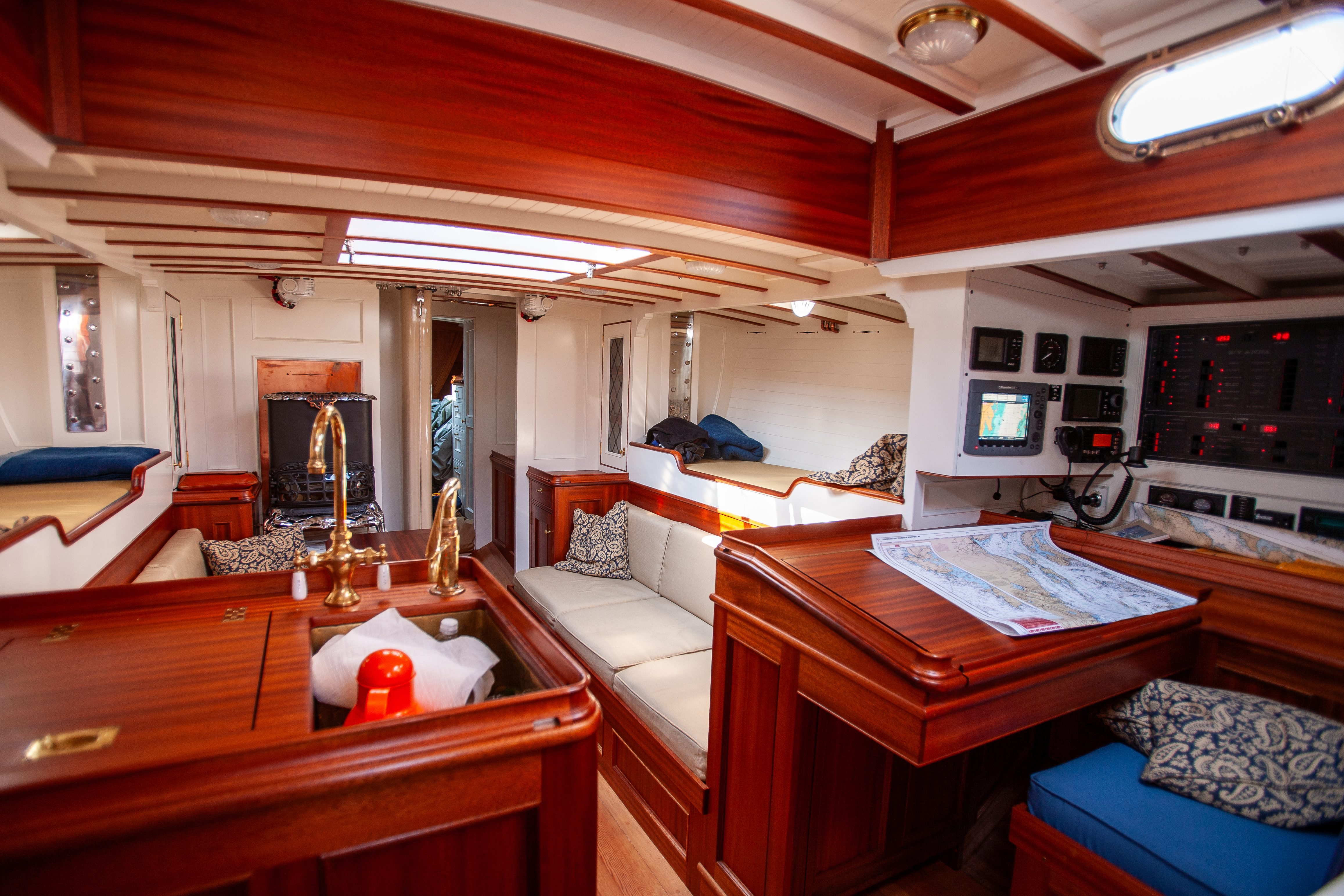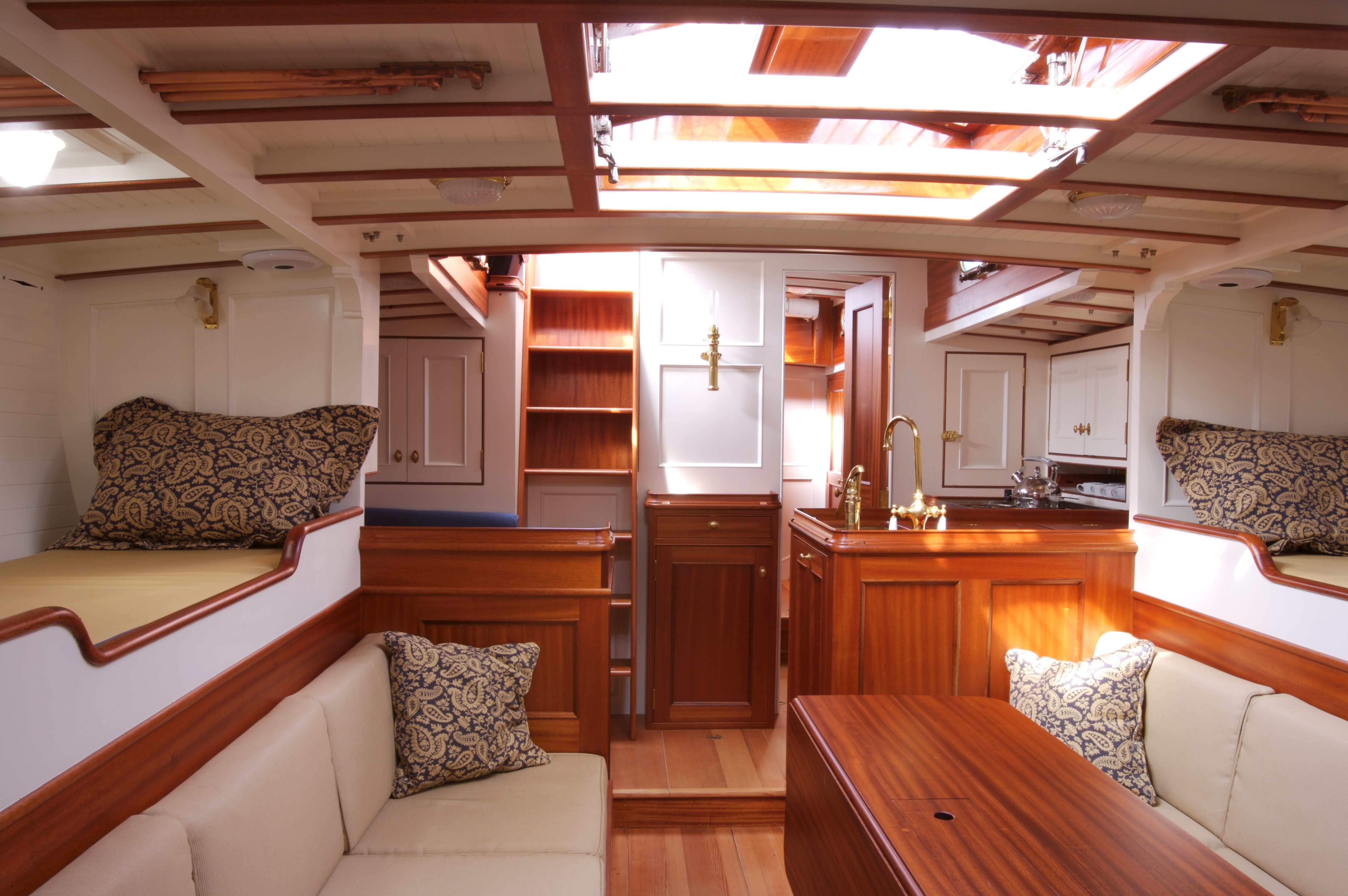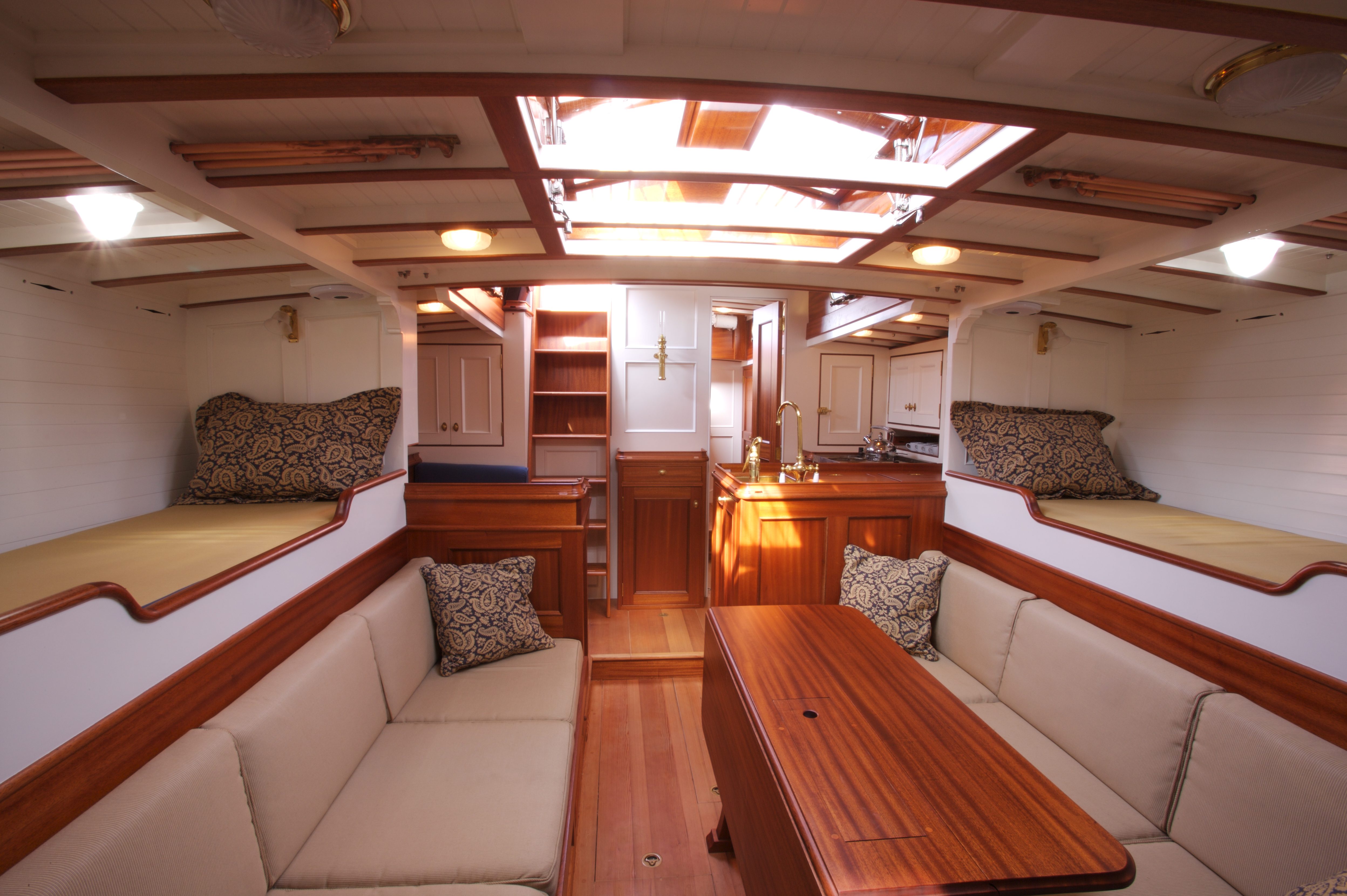 Below, ANNA offers a thoughtfully resolved interior that prioritizes both livability and proportion. The arrangement—developed in collaboration with the owner and design specialists—places the galley adjacent to the aft cabin and is a step away from two separate companionways for practical deck access and social integration. The arrangement while providing accommodation for two couples is flexible for additional guests in pilot berths. During build, the interior was prototyped at full scale prior to execution, resulting in a level of finish and ergonomic refinement rarely achieved in custom construction.