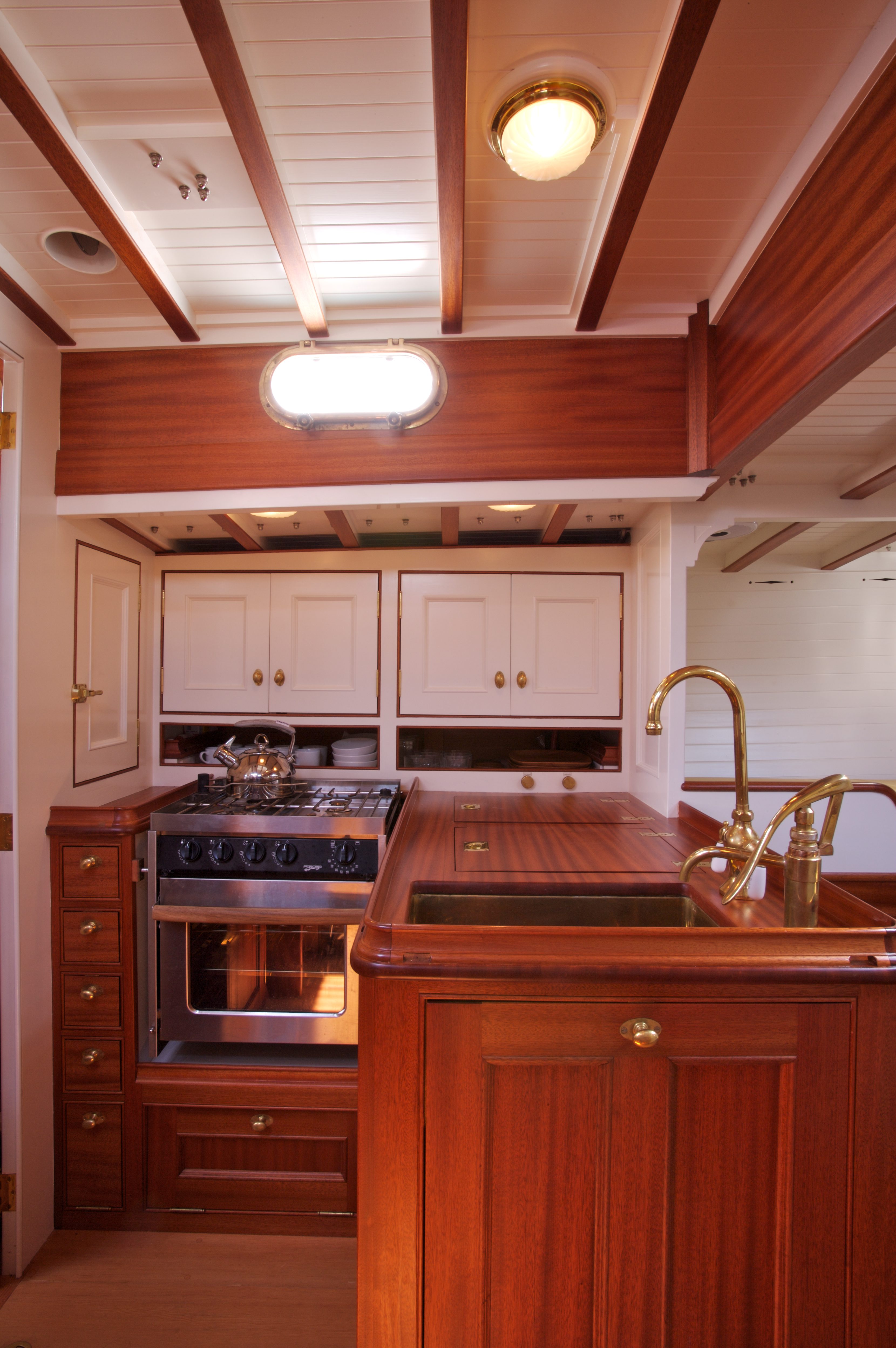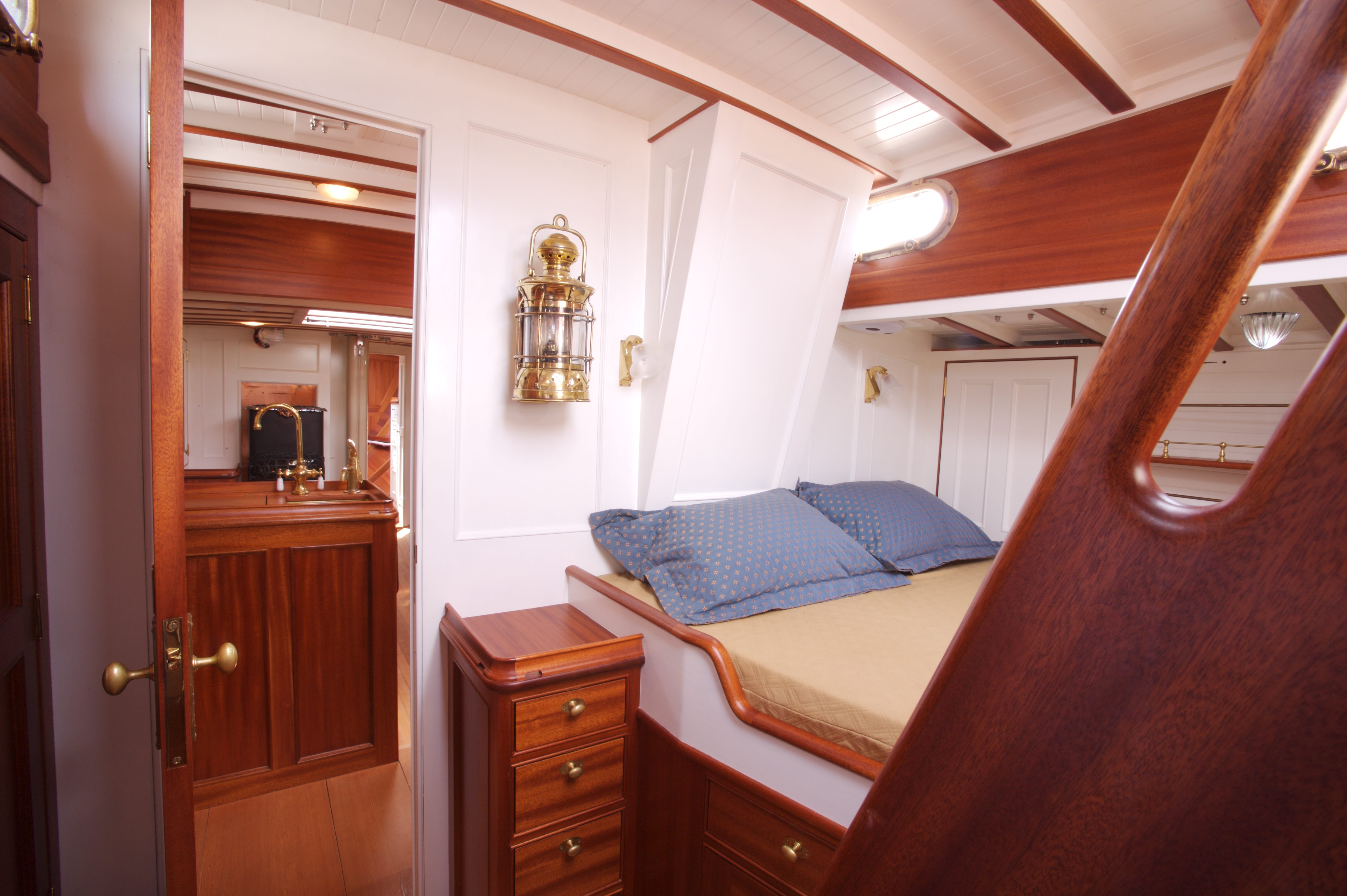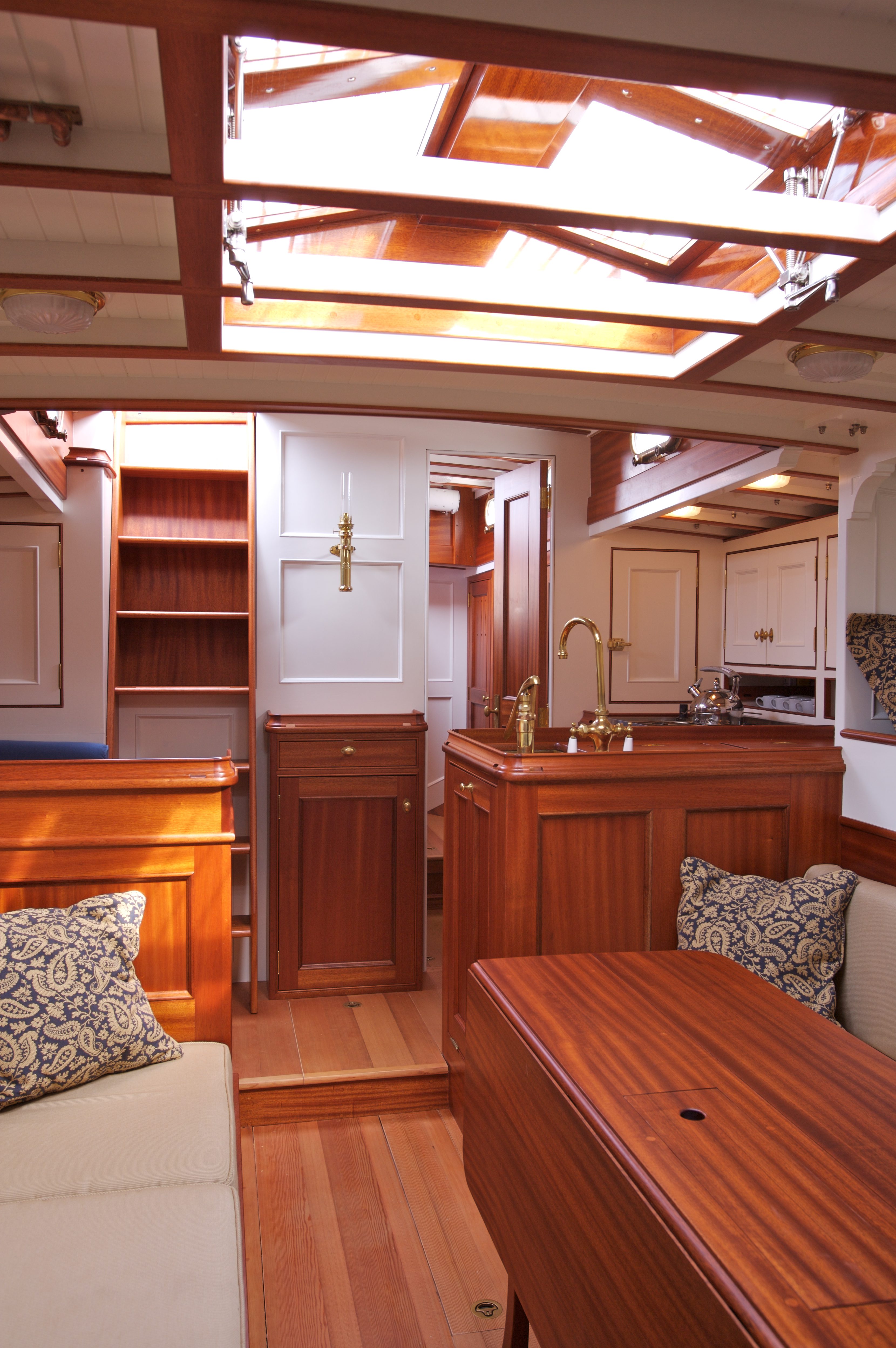 Below, ANNA offers a thoughtfully resolved interior that prioritizes both livability and proportion. The arrangement—developed in collaboration with the owner and design specialists—places the galley adjacent to the aft cabin and is a step away from two separate companionways for practical deck access and social integration. The arrangement while providing accommodation for two couples is flexible for additional guests in pilot berths. During build, the interior was prototyped at full scale prior to execution, resulting in a level of finish and ergonomic refinement rarely achieved in custom construction.