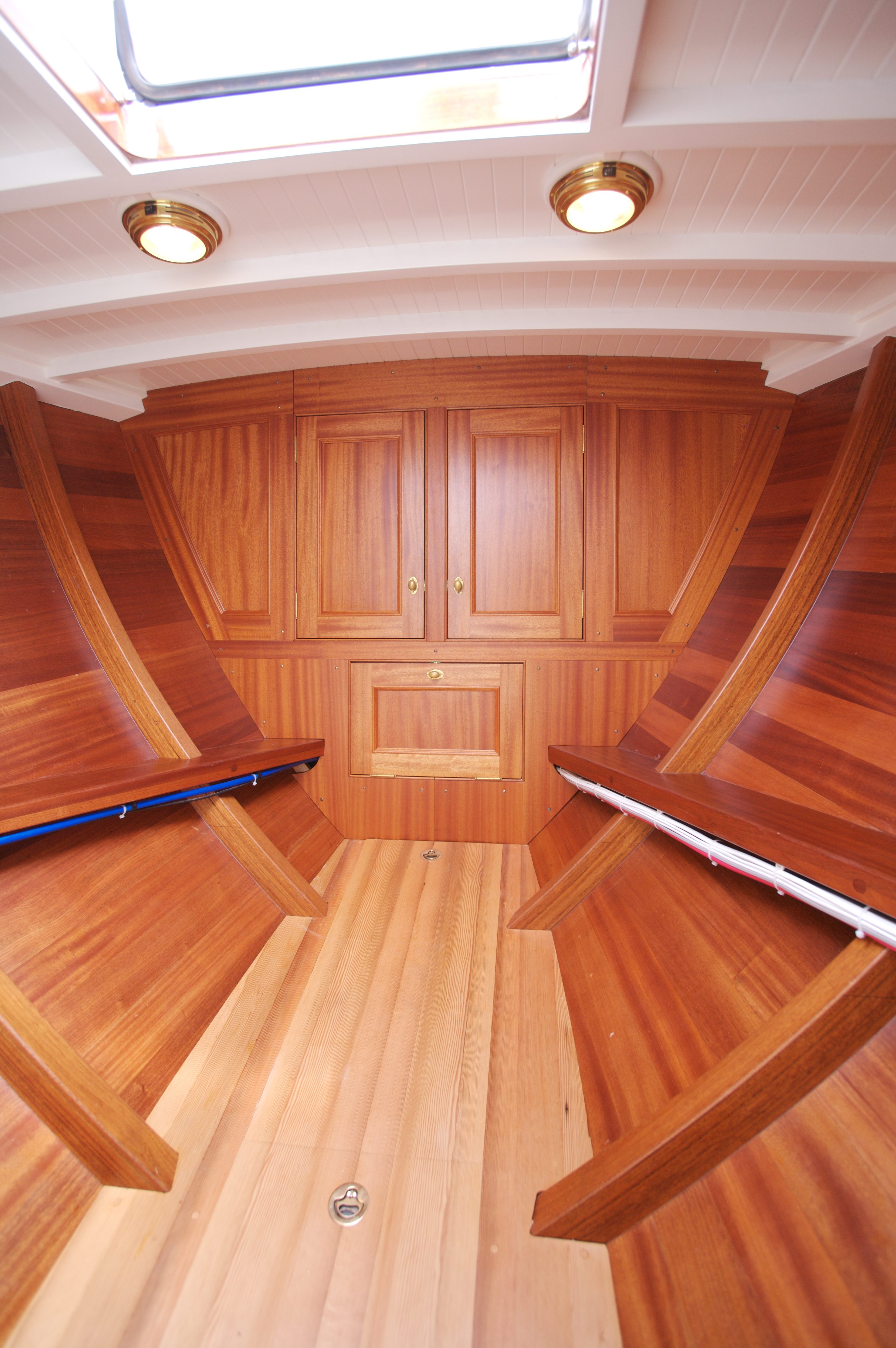 Her cold-molded hull and structures are executed in mahogany, western red cedar, and Port Orford cedar with epoxy consolidation—this achieves a rare balance of structural integrity and weight discipline. Below the waterline, a bulbed fin keel and spade rudder provide lift, control, and tracking well beyond what her classical profile suggests. Above deck, carbon fiber mast and boom reduce inertia and enhance sail-handling precision, while systems throughout have been engineered for shorthanded operation without compromise.