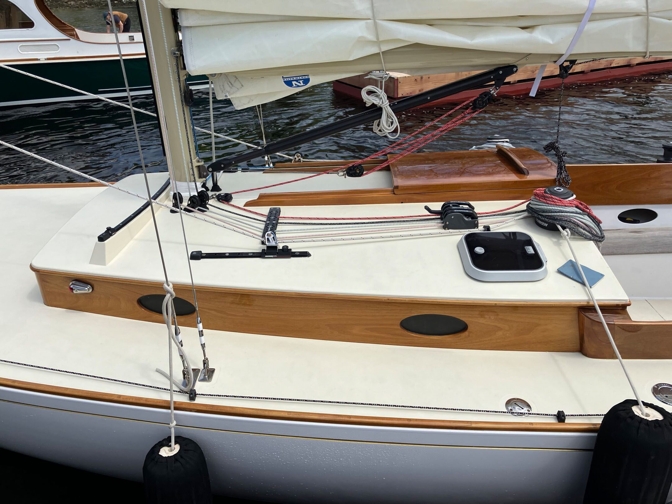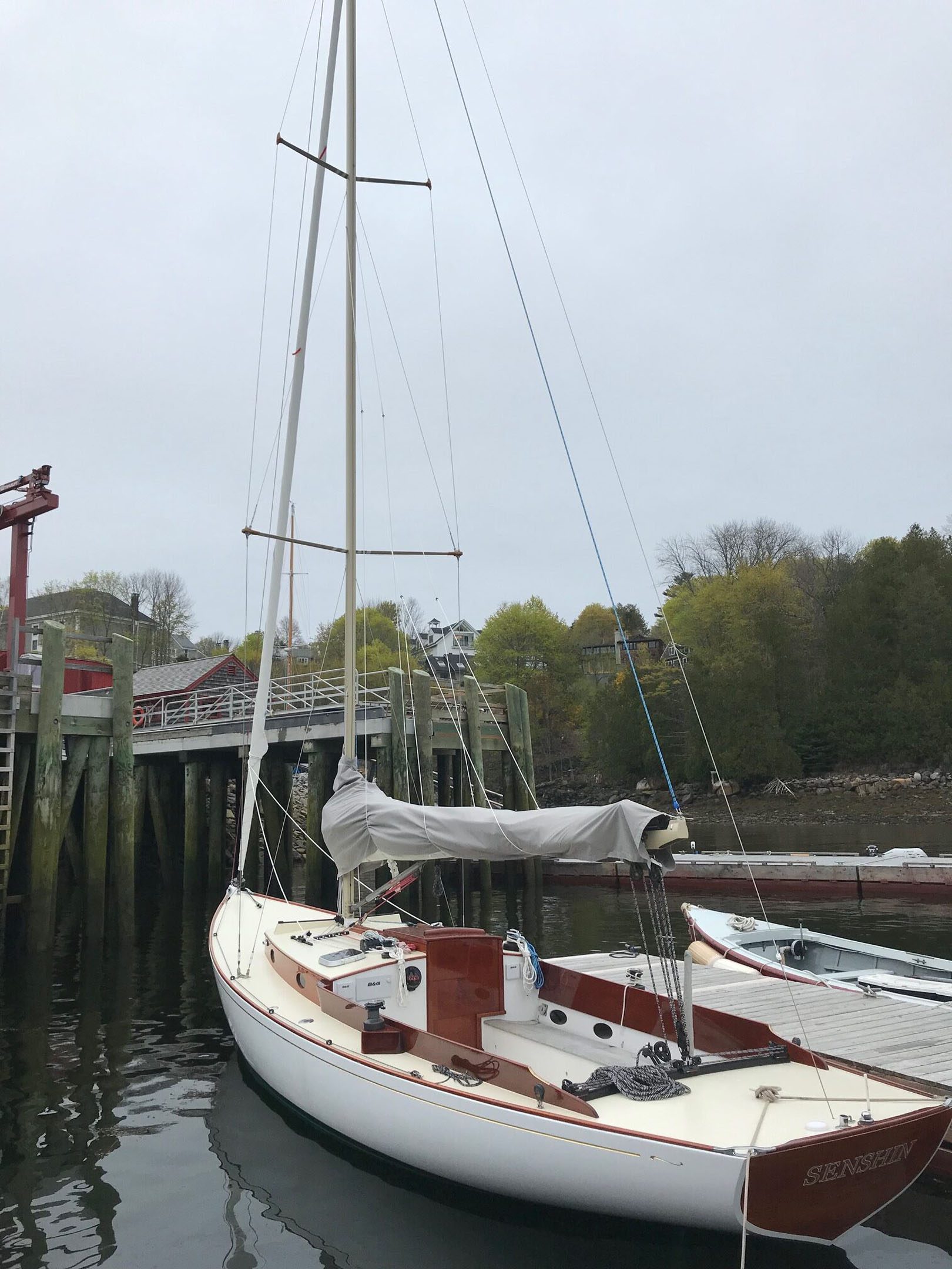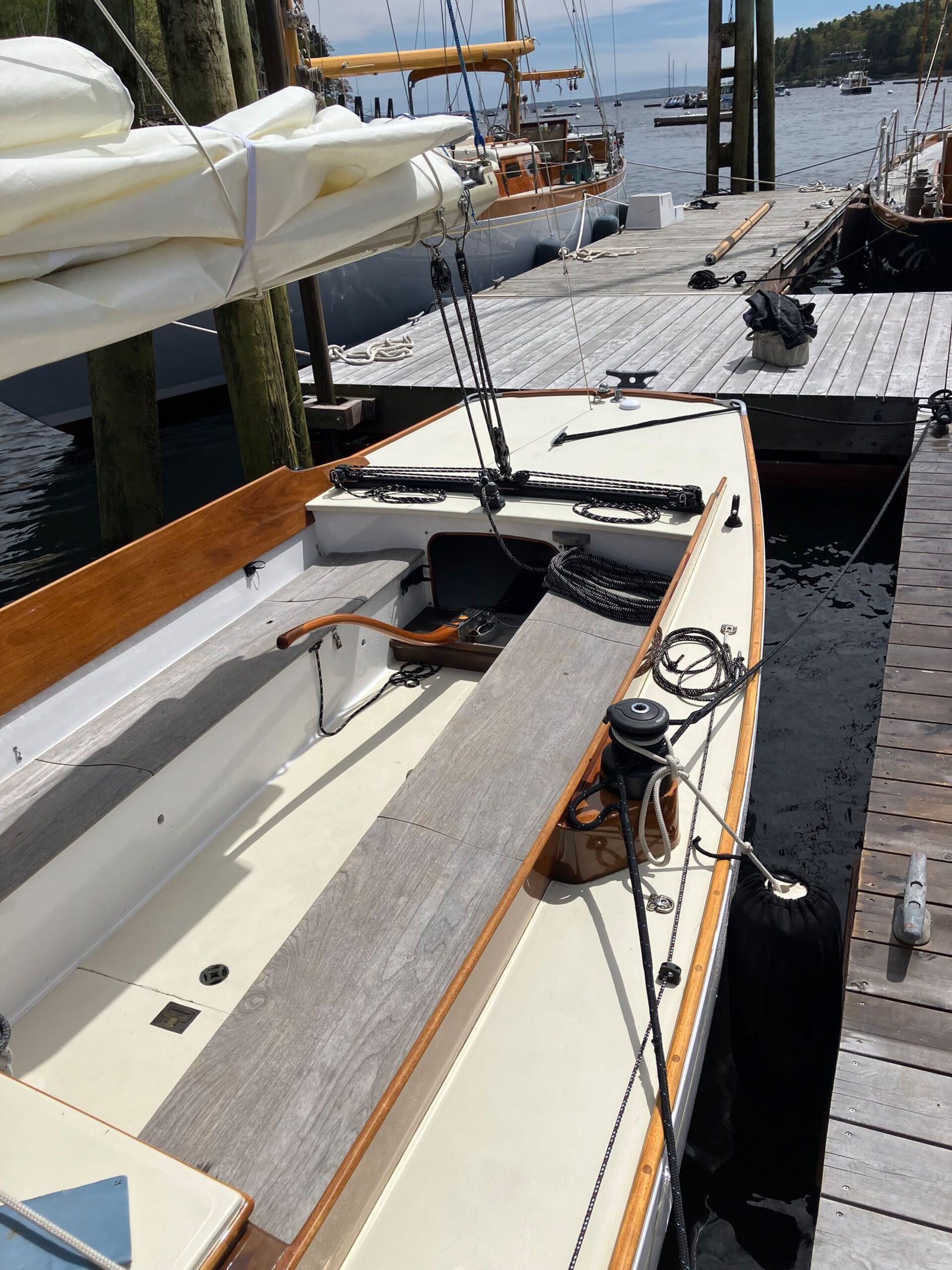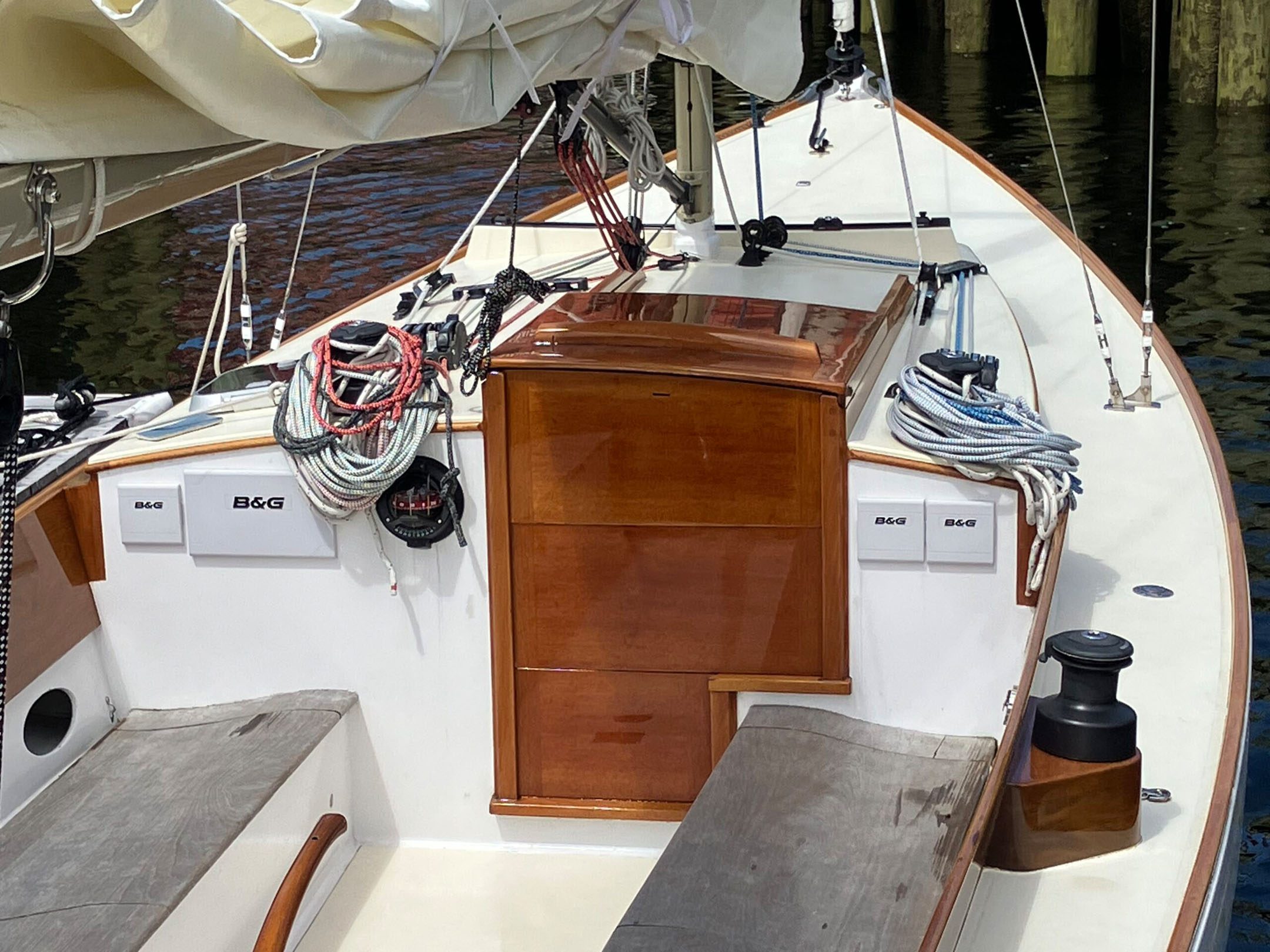 SENSHIN is hull #2 of the highly acclaimed Center Harbor 31 class, designed by Joel White and built by Brooklin Boat Yard as fine day-sailers and weekenders. An early example of the Spirit of Tradition genre, the class was inspired by L. Francis Herreshoff’s classic QUIET TUNE design, but designed to be much more user-friendly than her classic cousin, incorporating low-maintenance wood/epoxy composite construction, modern rig and underbody, and much-reduced displacement for sparkling performance, both on the race course and in casual day sailing.