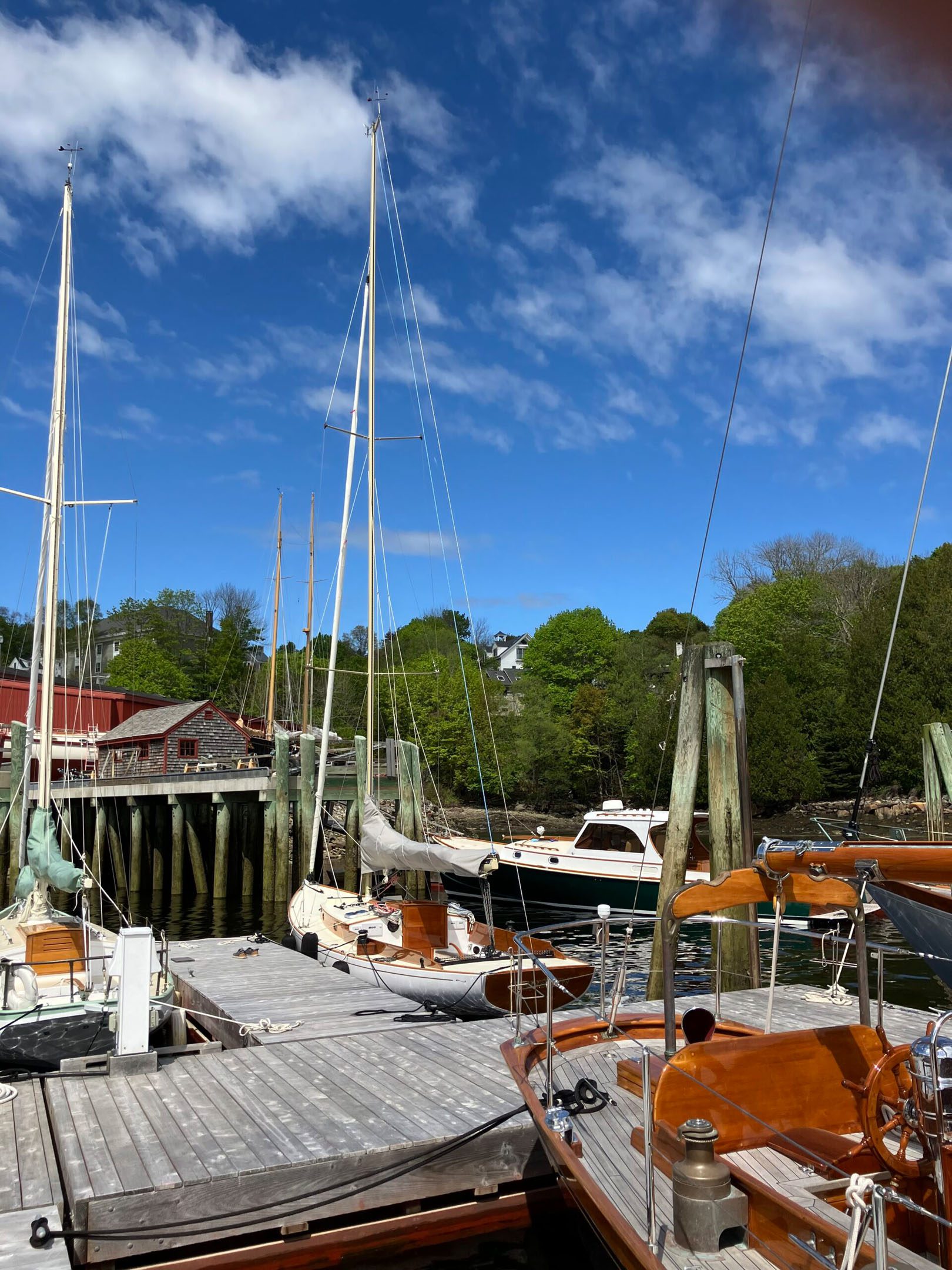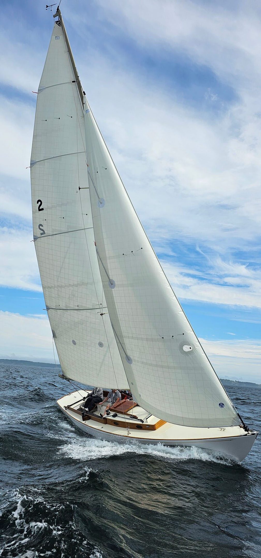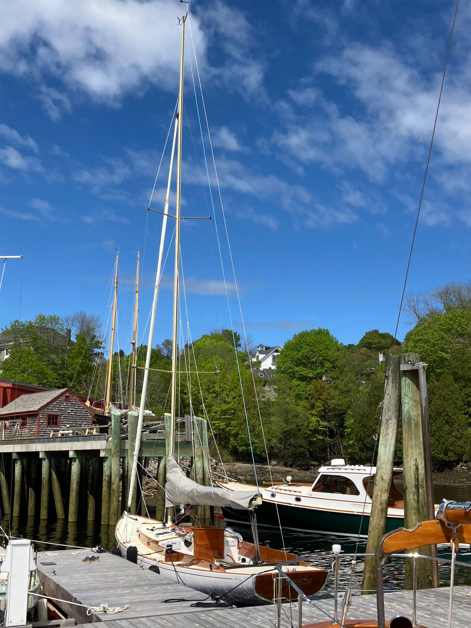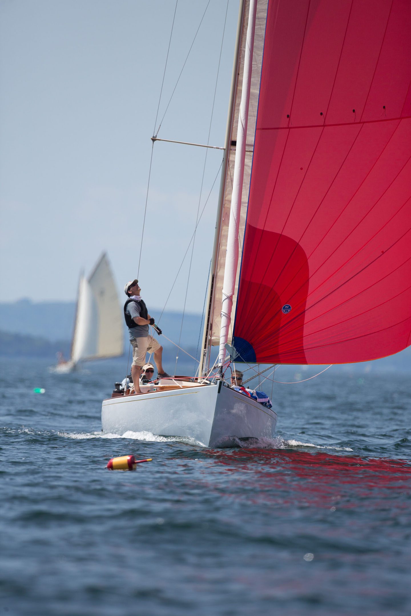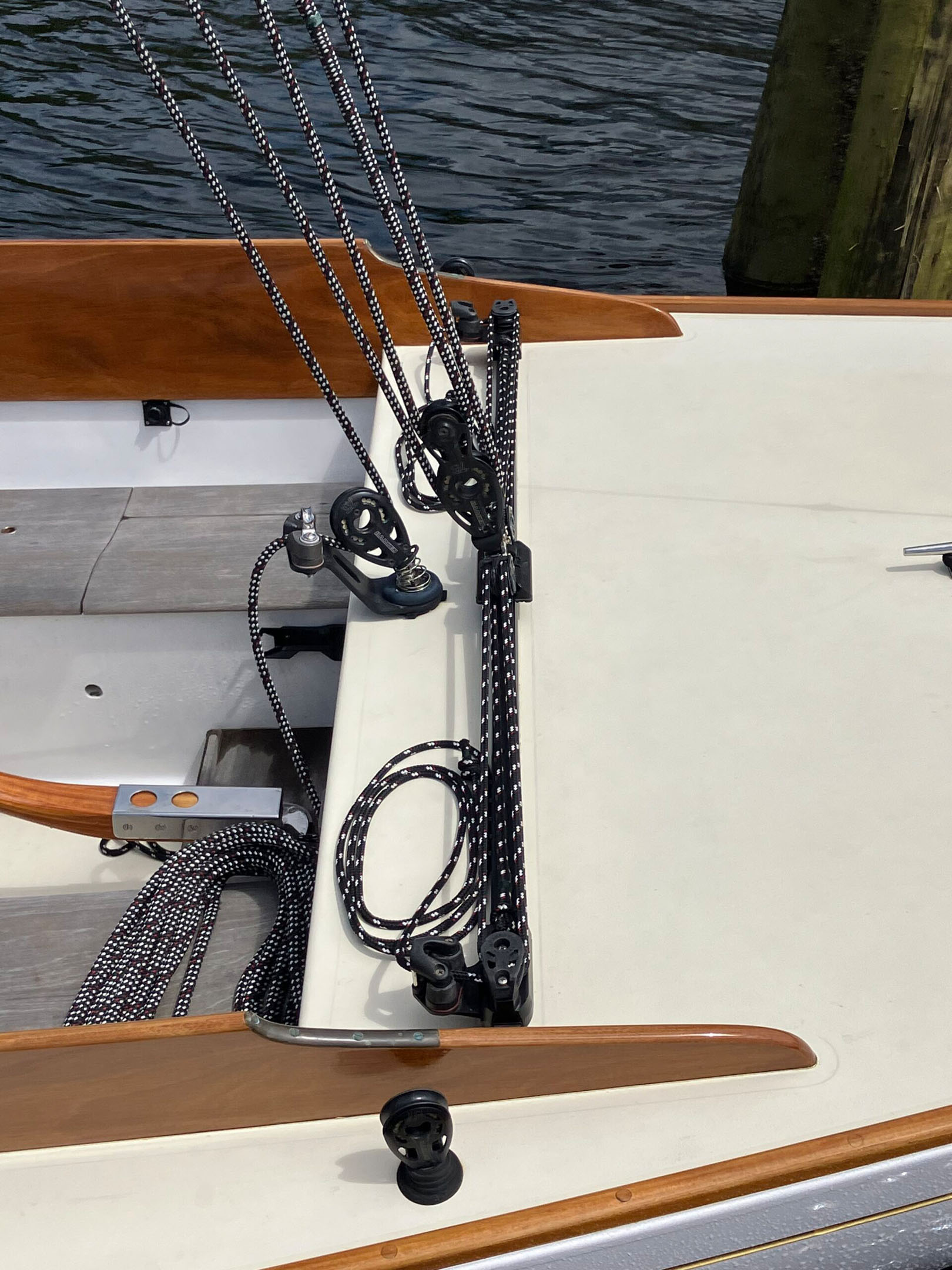 SENSHIN is hull #2 of the highly acclaimed Center Harbor 31 class, designed by Joel White and built by Brooklin Boat Yard as fine day-sailers and weekenders. An early example of the Spirit of Tradition genre, the class was inspired by L. Francis Herreshoff’s classic QUIET TUNE design, but designed to be much more user-friendly than her classic cousin, incorporating low-maintenance wood/epoxy composite construction, modern rig and underbody, and much-reduced displacement for sparkling performance, both on the race course and in casual day sailing.