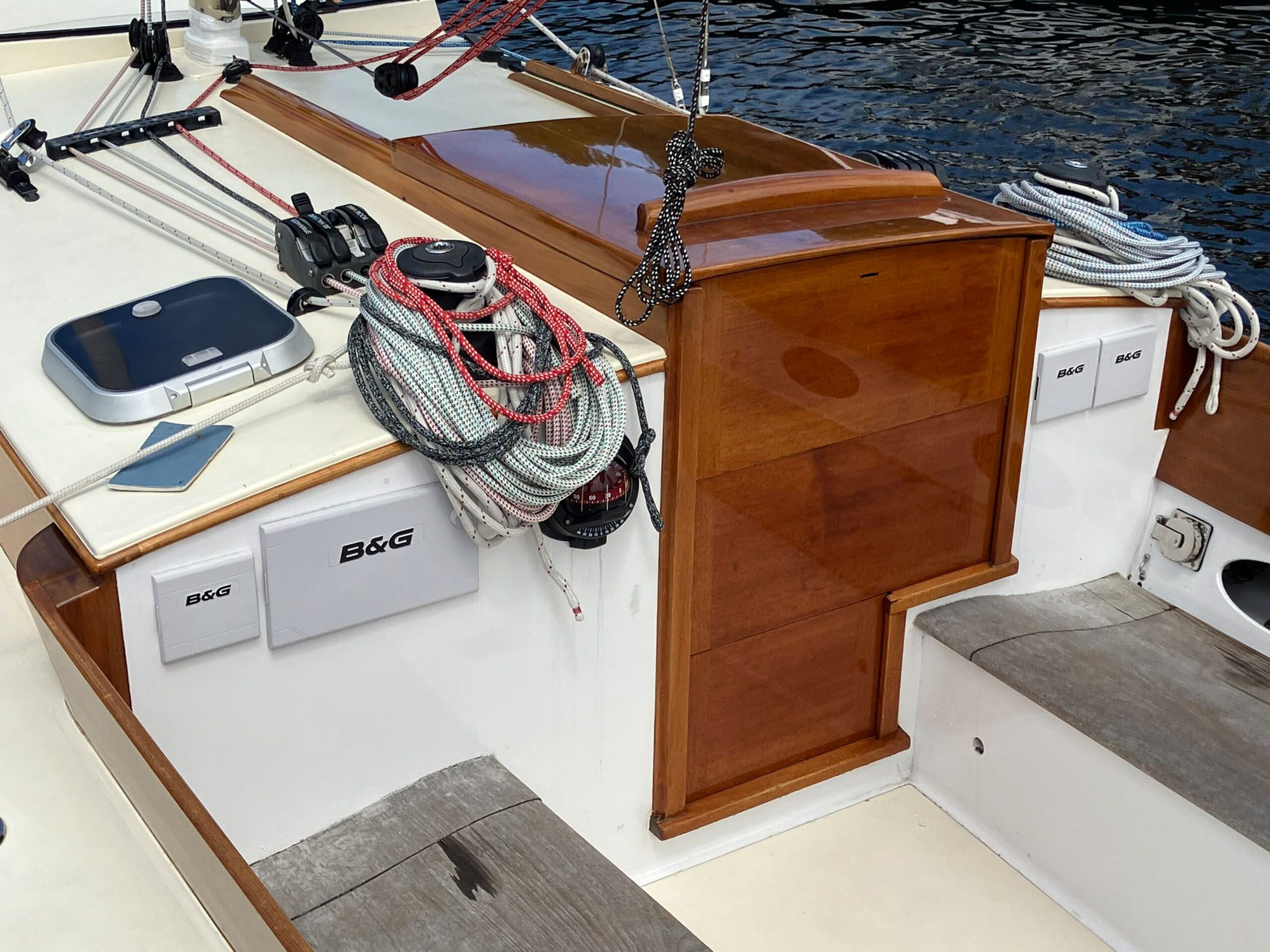 Cockpit is self-bailing with painted non-skid Awlgrip. Engine hatch in forward end of cockpit sole. Four opening cockpit seat lockers offering capacious storage for sails and gear; aft starboard locker is insulated and drained to serve as ice chest. Painted footwell sides and cockpit sides below varnished coamings, with storage cubbies outboard of seats for winch-handles and other small gear. Cockpit seats are quarter-sawn solid teak, raked and carved to shape for comfortable seating. Curved laminated varnished mahogany tiller. Lazarette accessed through aft bulkhead of cockpit.