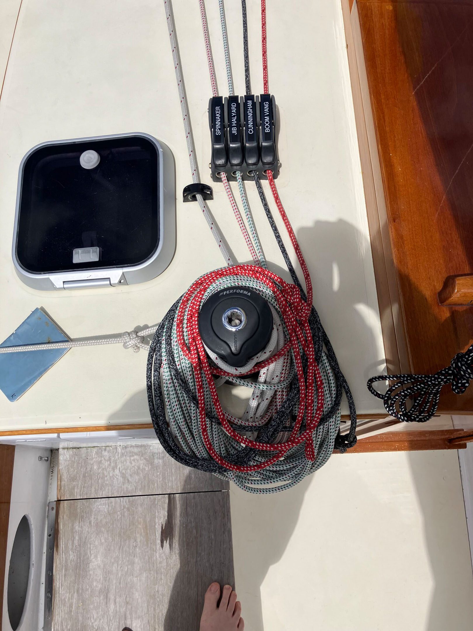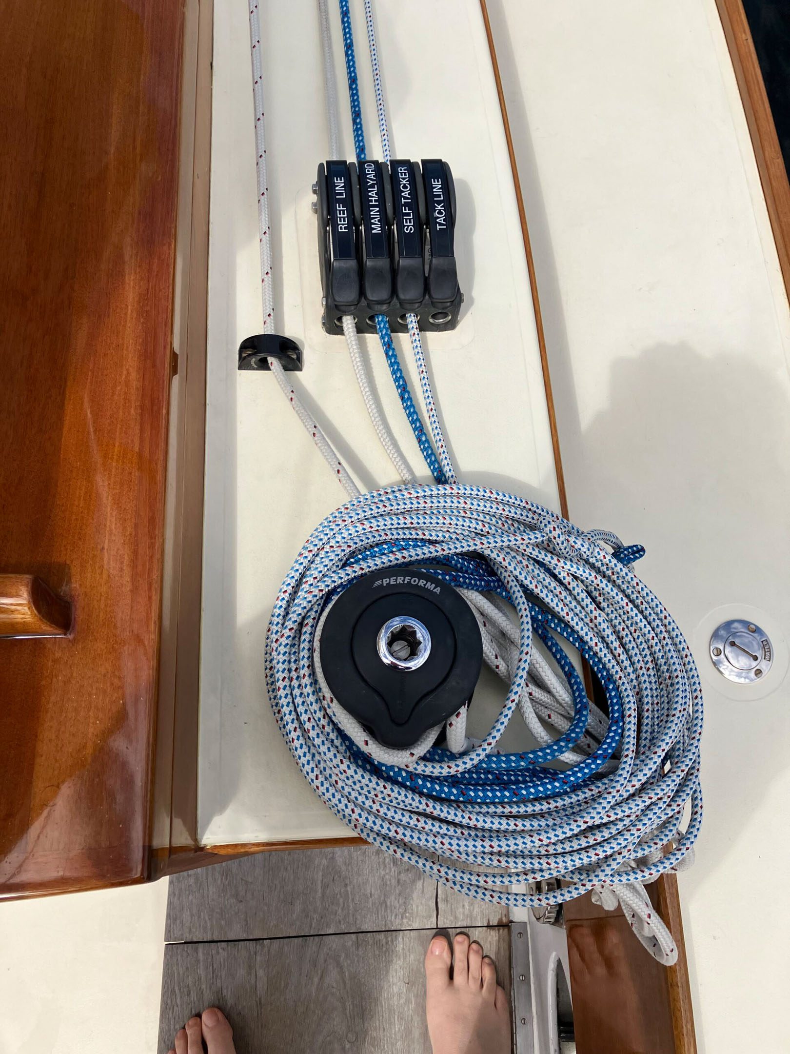 Boom Vang: Hall Quik-vang, control line led to port cabin top winch