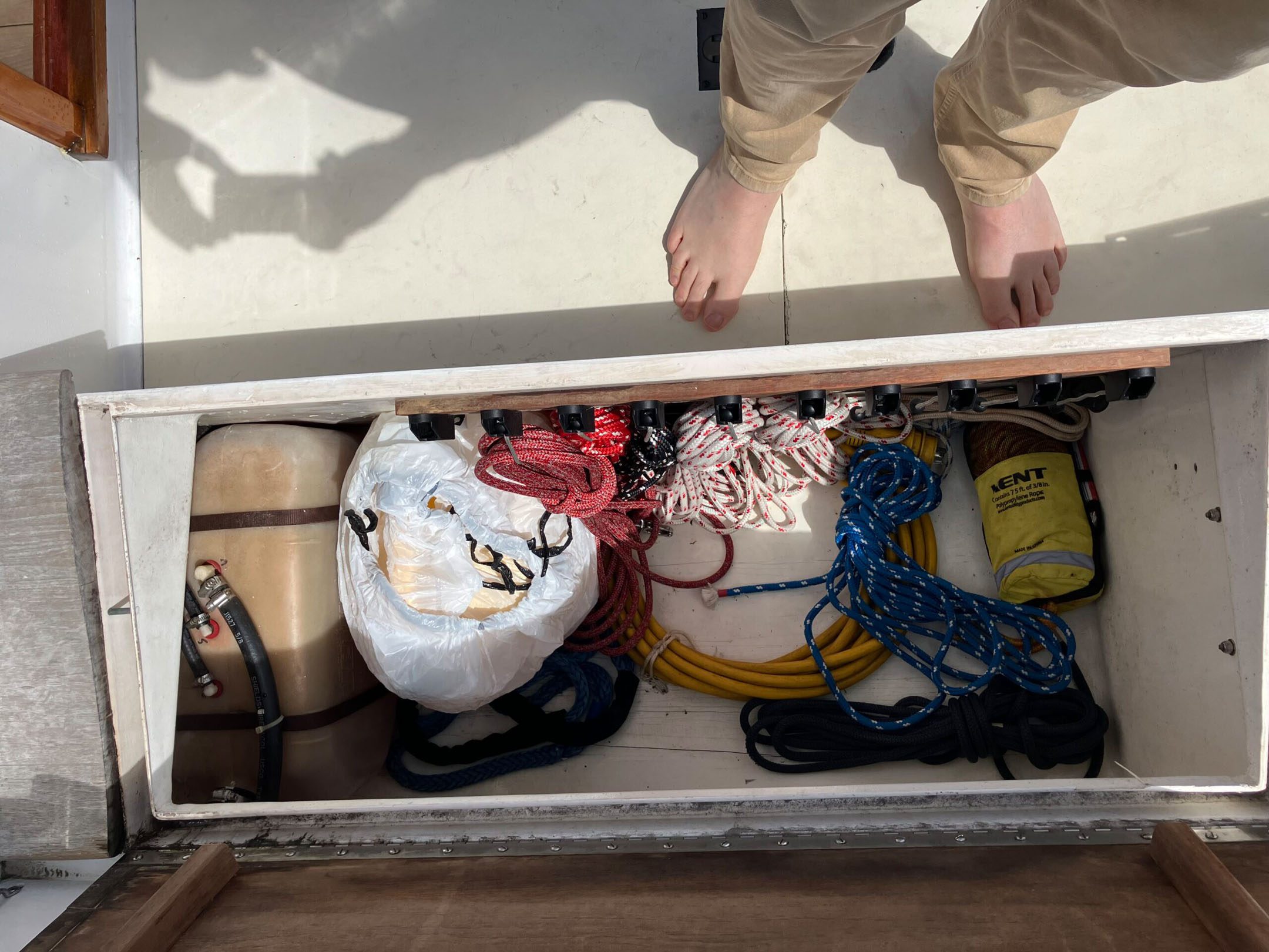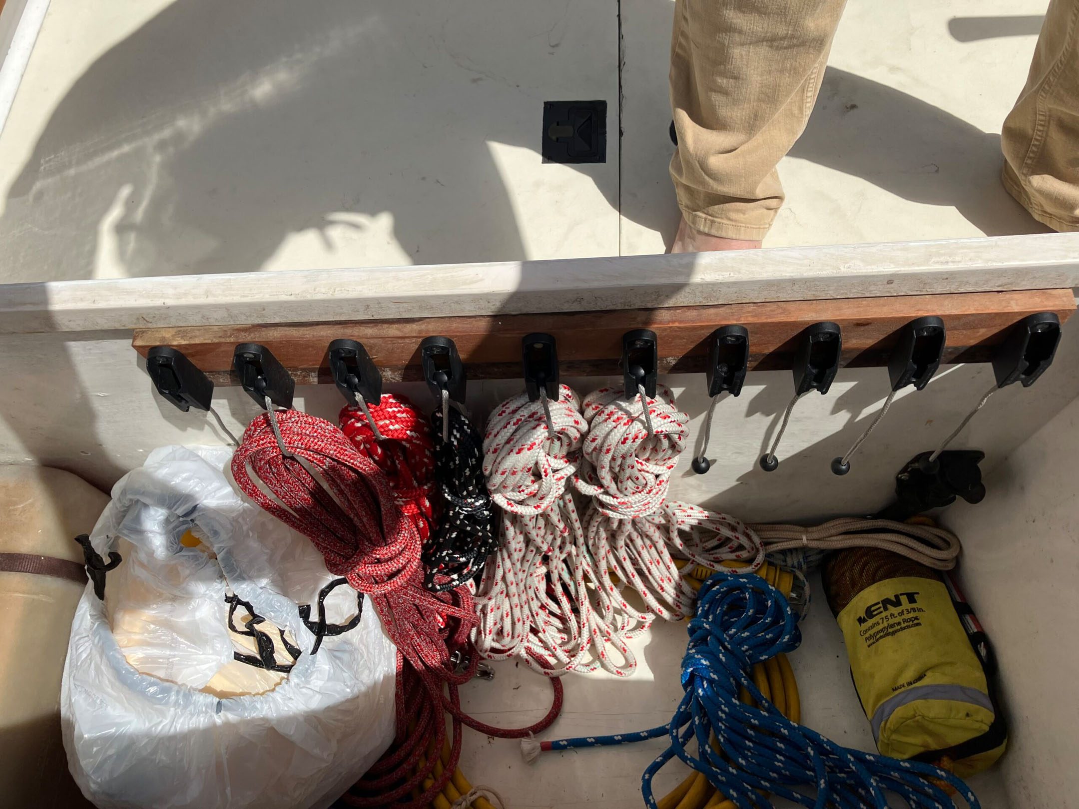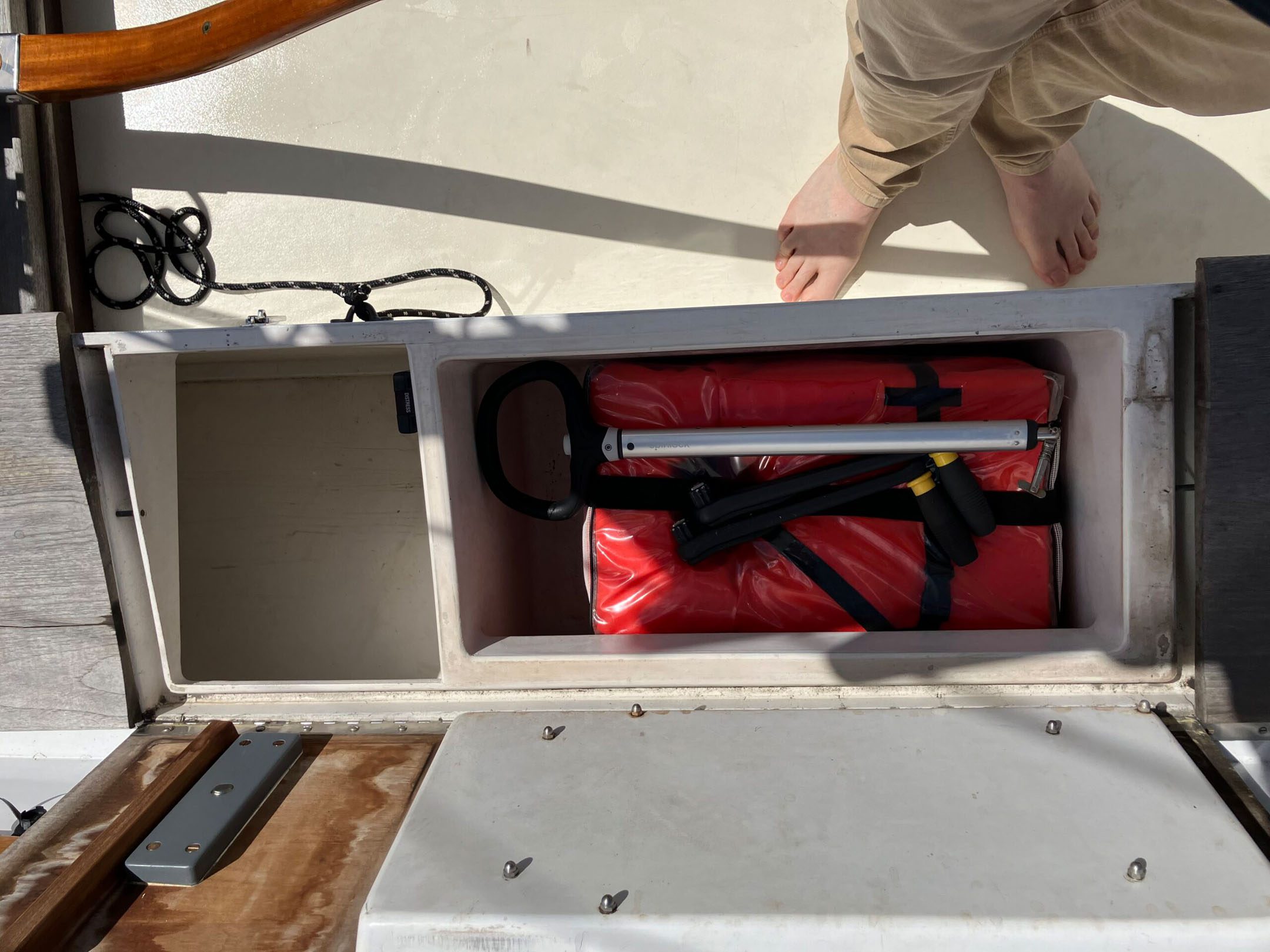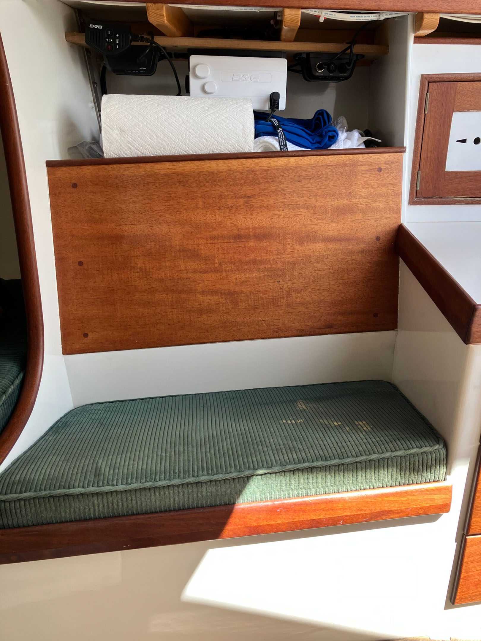 Next forward, two upholstered seats face each other, carefully crafted for comfortable sitting, with storage outboard. Forward of the seats is a vee-berth. An open anchor/sail locker is forward of berths.