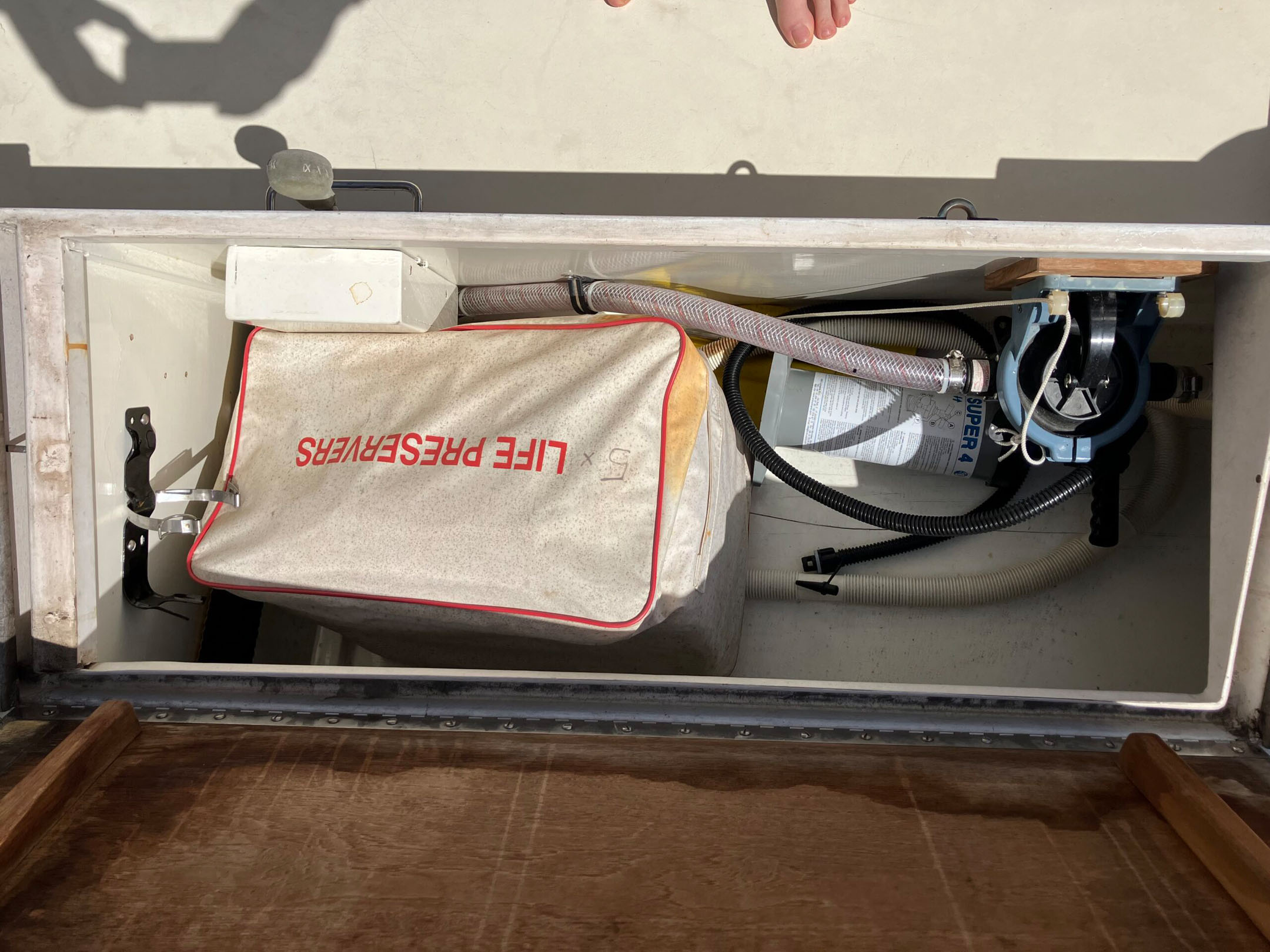 Manual bilge pump: Jabsco Amazon 11 gpm mounted in cockpit side.