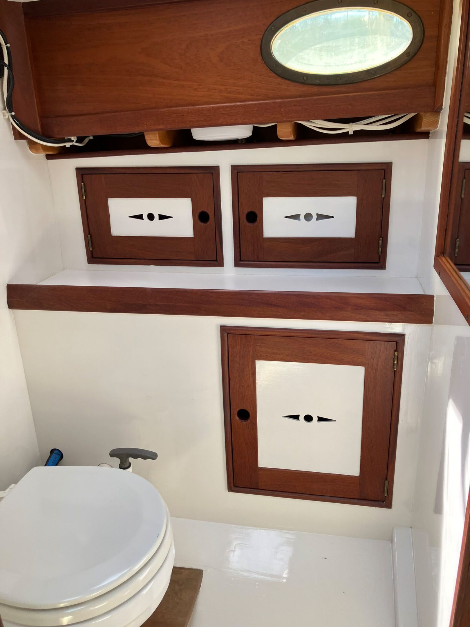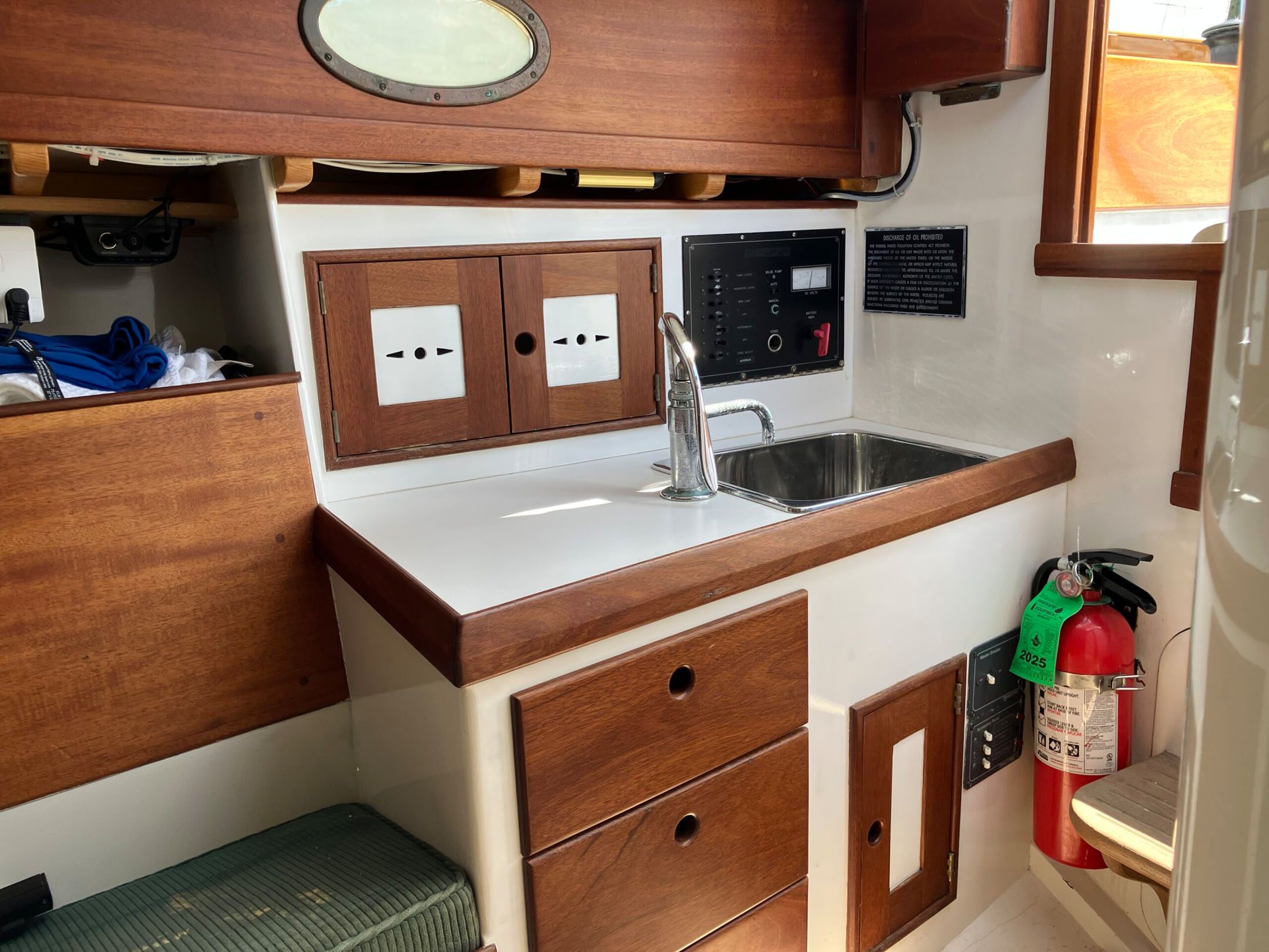 The companionway is offset to starboard, providing airiness for galley area and extra room for enclosed head to port. The enclosed head uses a curved door for easier access and provides privacy for using the manual marine toilet. The galley offers stainless steel sink with fresh water via hand pump, counter space for prep or cooking using a single-burner free-standing butane stove, and cabinets for dish and dry-goods storage outboard.