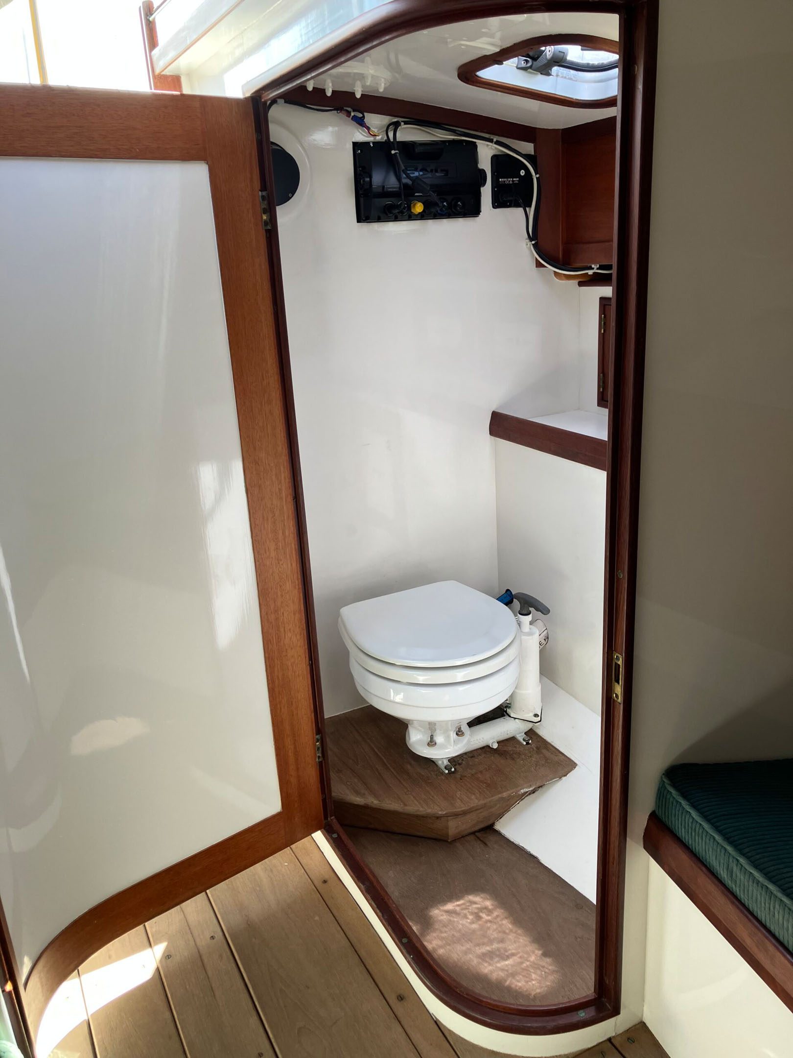 Toilet: manual pump, discharge through Y-valve: overboard or to holding tank with deck pump-out access.