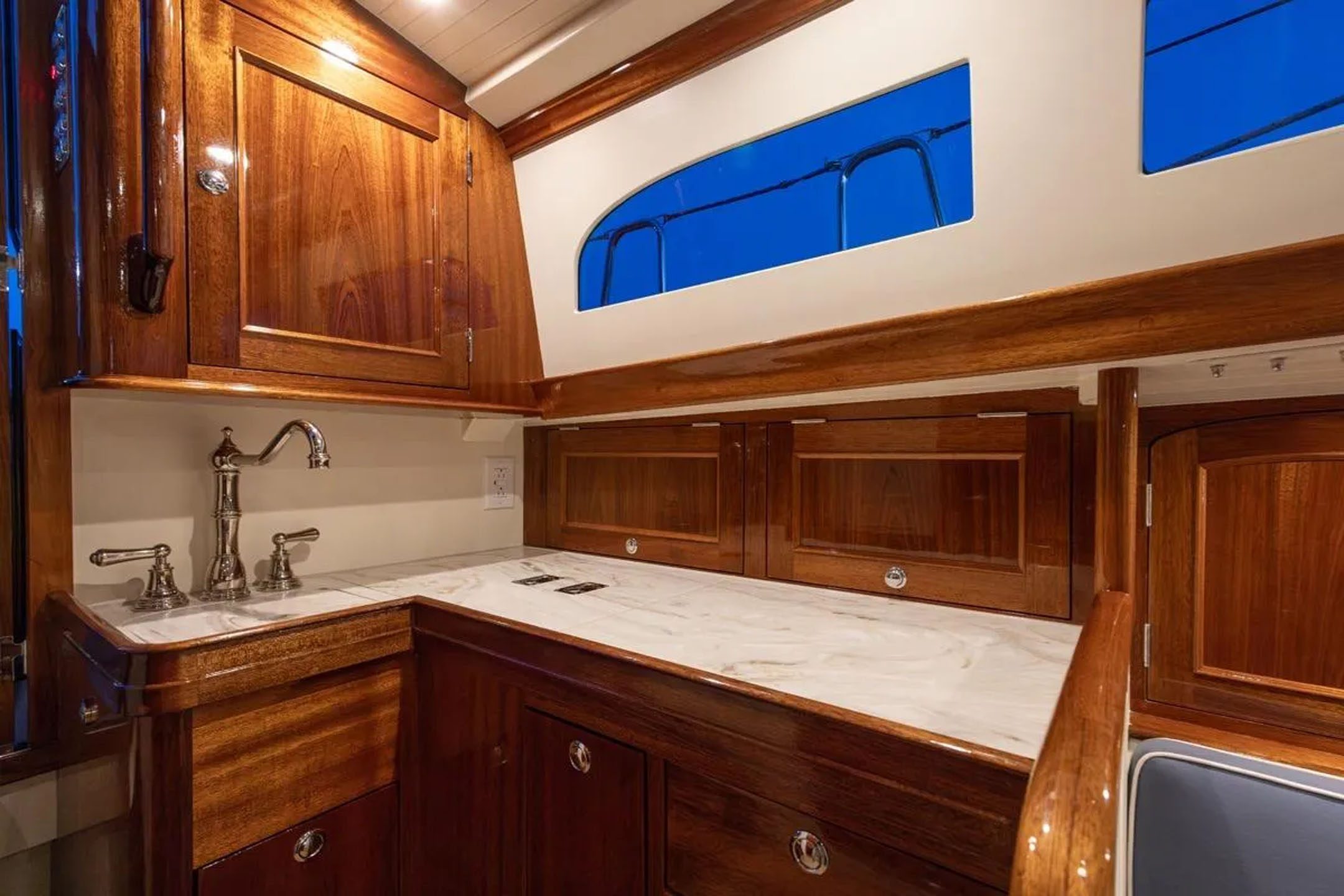 On deck, WISP offers a sophisticated, dual-purpose cockpit: a plush, upholstered area for lounging forward with a dedicated sailing zone aft.