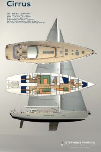 CIRRUS has a hull that eclipses the edgy plumb stem, a classic spoon-shaped bow, and a counter stern. There’s a hint of vee at hull centerline and a note of tumblehome at sheer— the yacht sports moderate overhangs in profile.