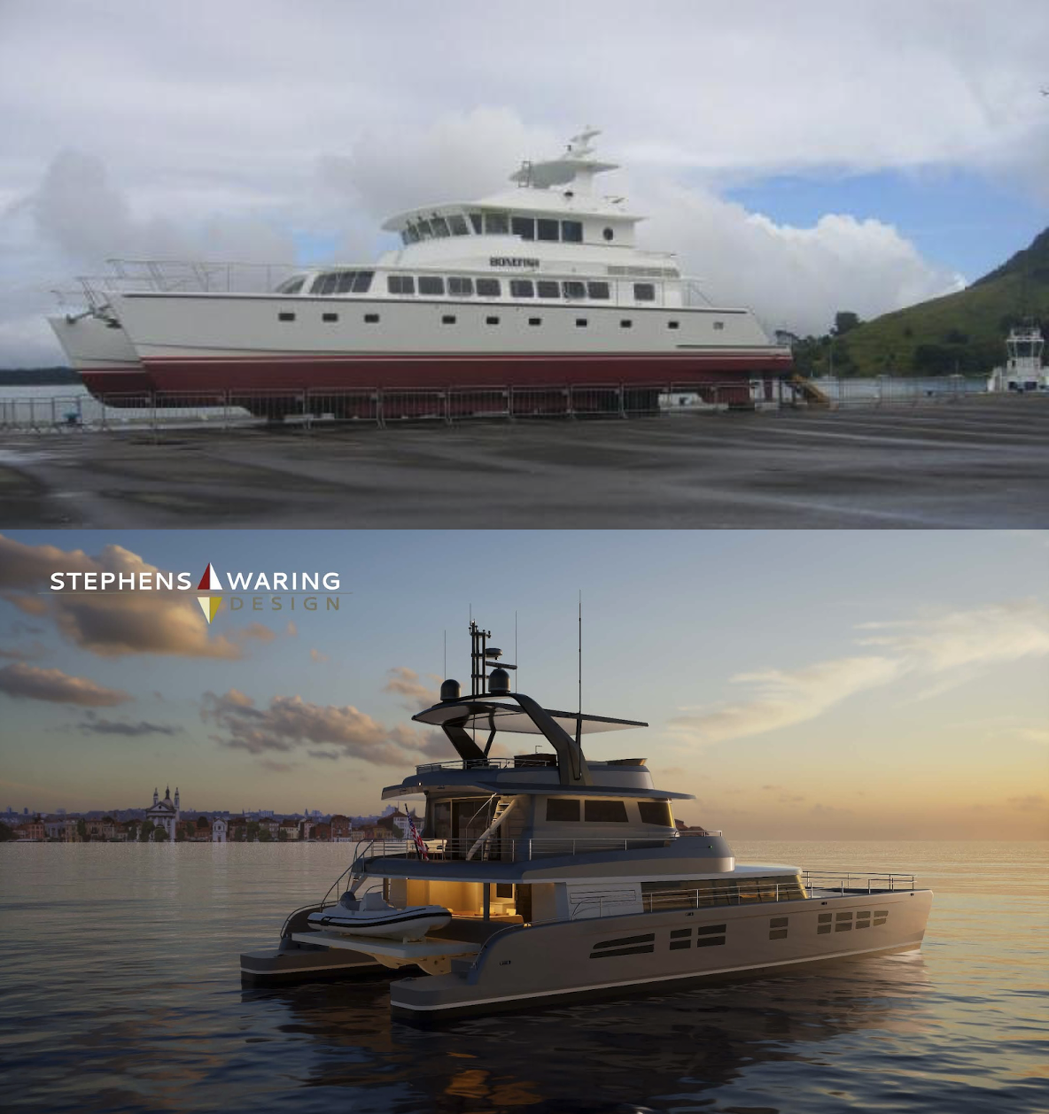 Most recently, Stephens Waring has embarked on one of the most ambitious Resto-mod projects in its books. We were tasked with a complete rethink and reimagination of a 25M powercat. The yacht was initially designed by Derek Kelsall, a notable New Zealand designer who made a name for himself with multihull designs in the 1990s.