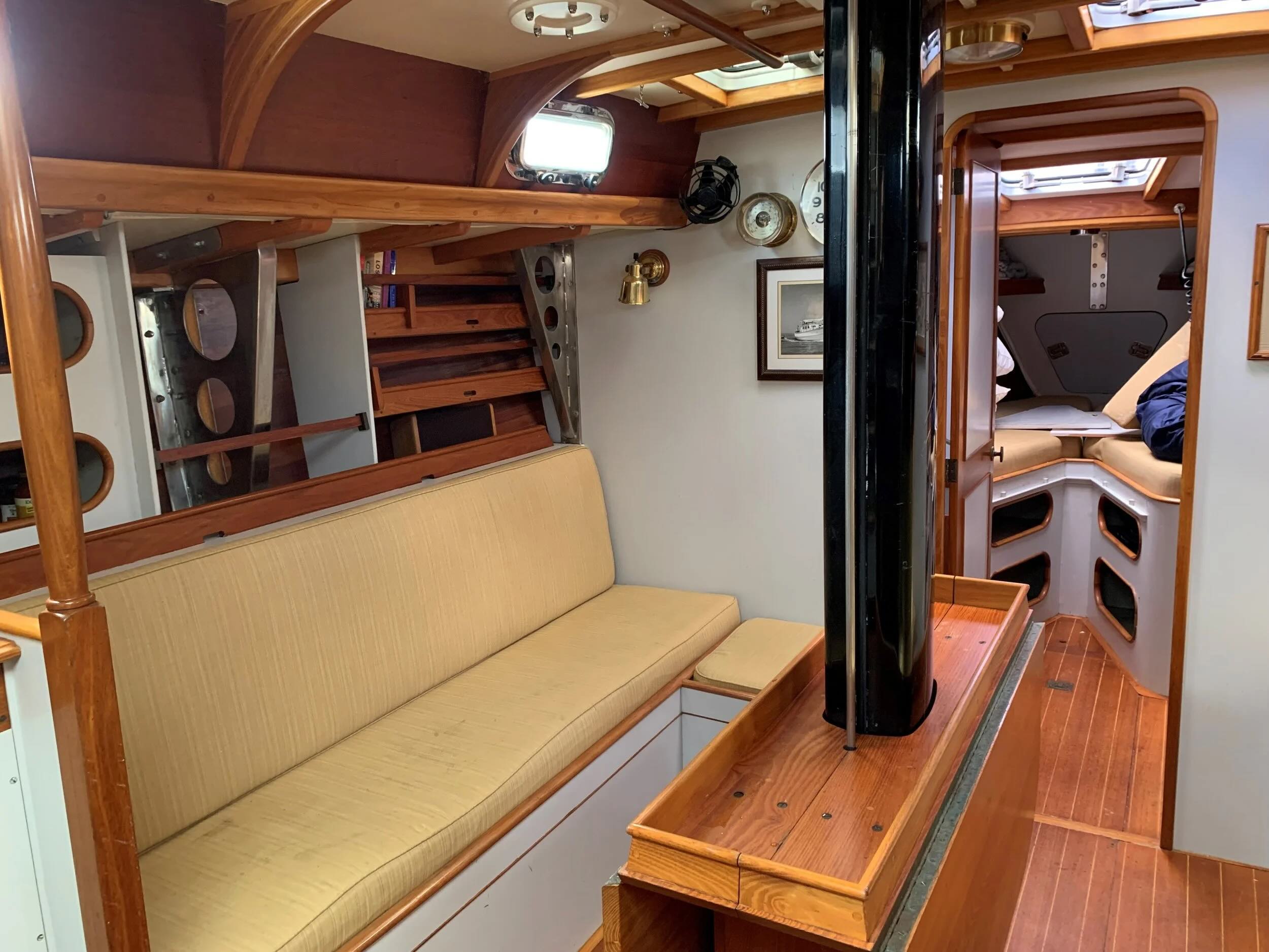 Her cold-molded, wood-epoxy hull is the kind of construction that ages with grace. Her hybrid diesel-electric propulsion system, ahead of its time when installed, offers extended range, reduced fuel consumption, and a surprisingly quiet running environment. Her rig is serious: twin headstay Solent-style rig, electric furling, full-battened main, all lines led aft. Everything you need for short-handed offshore sailing.