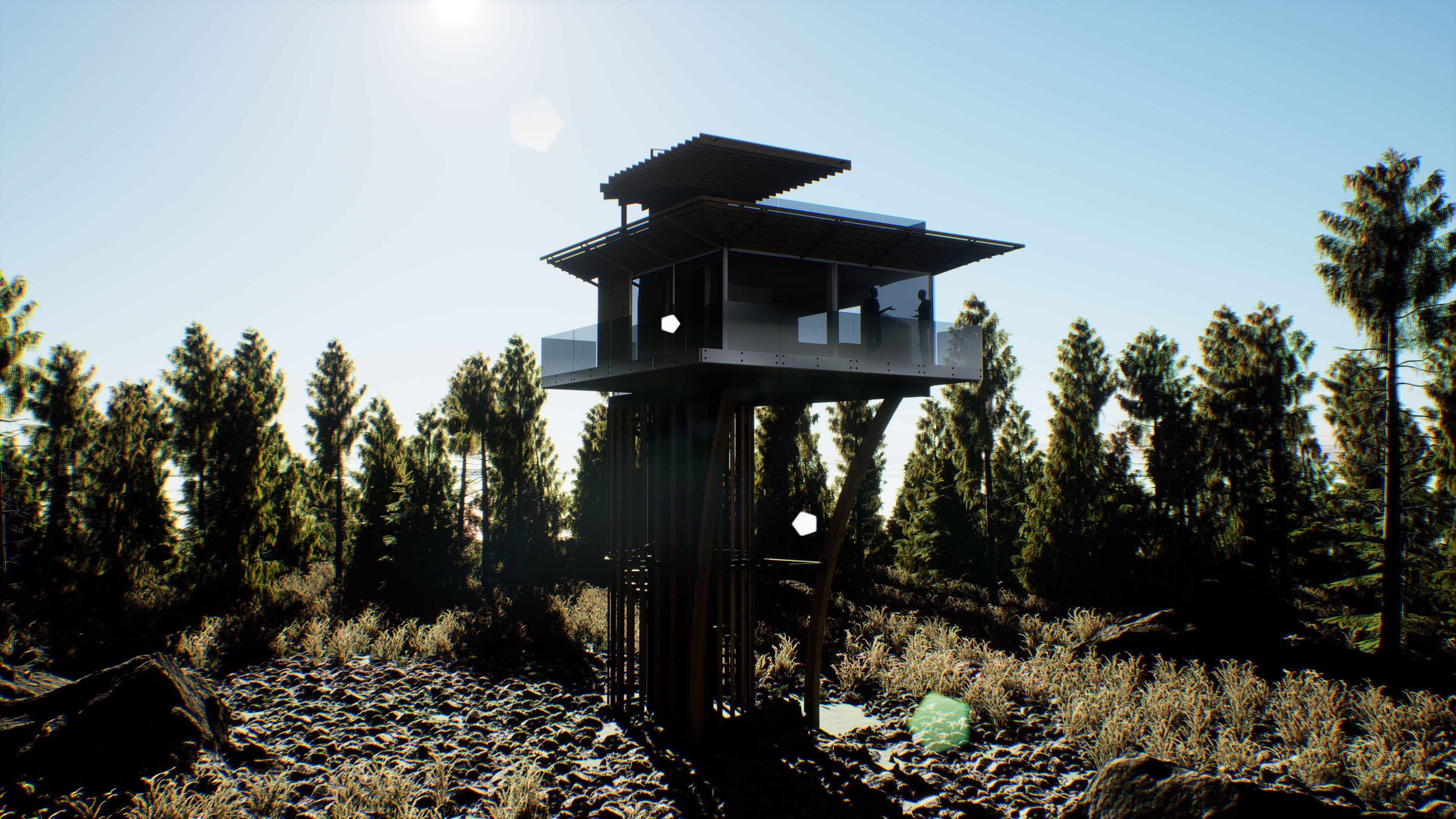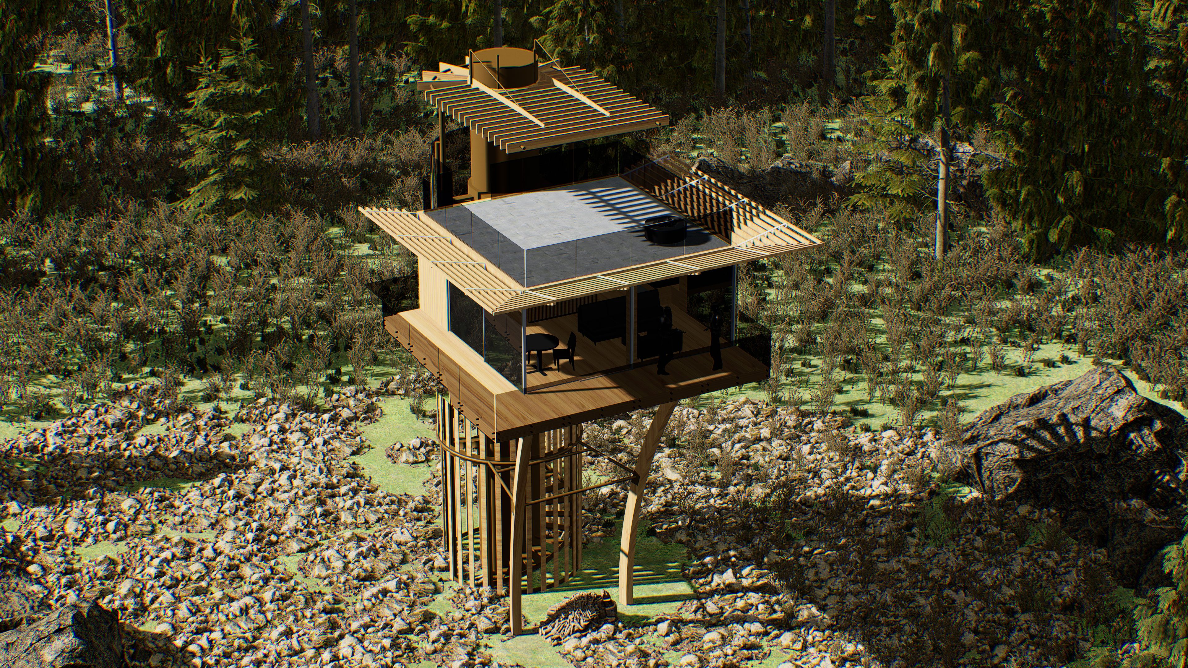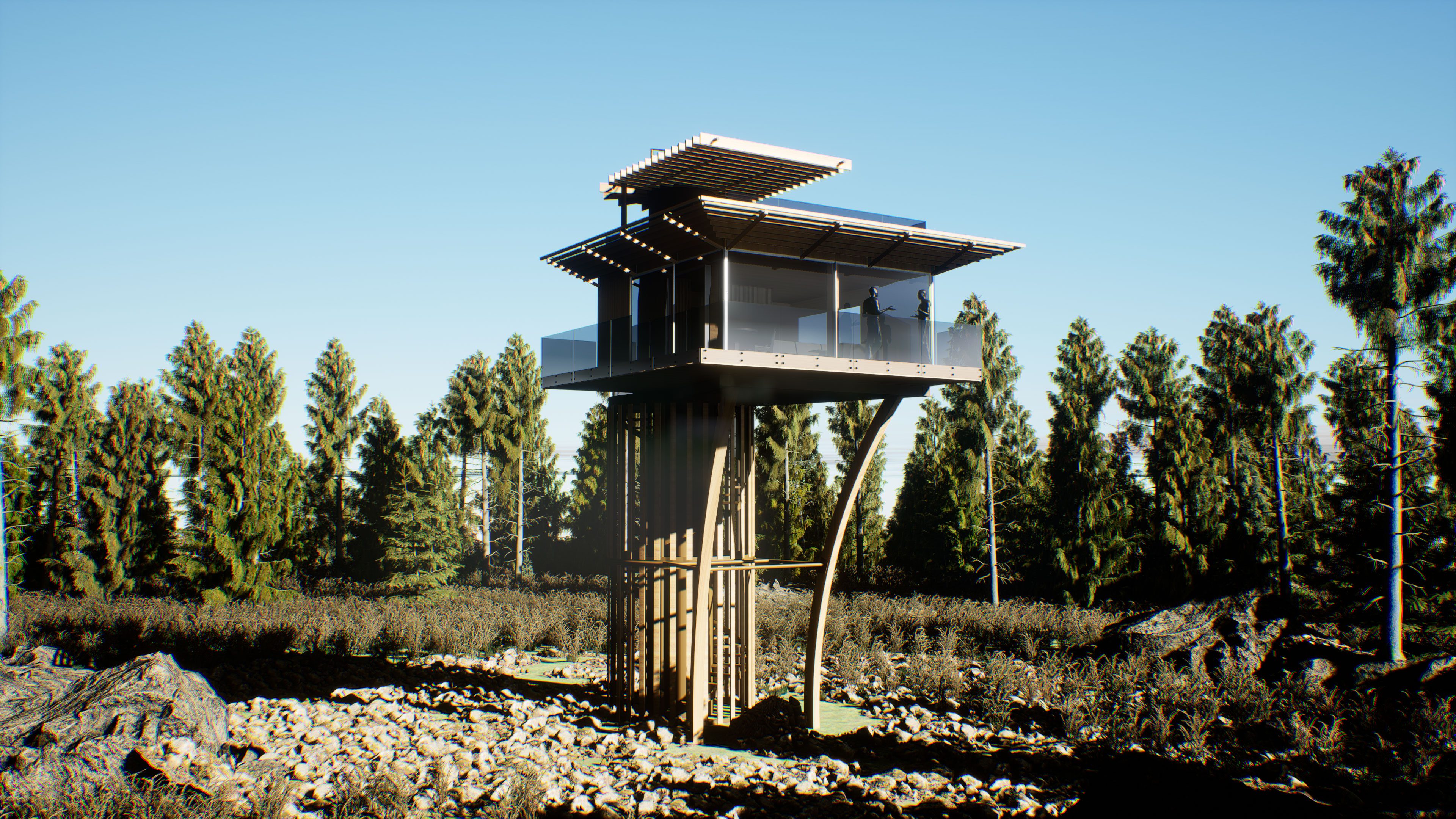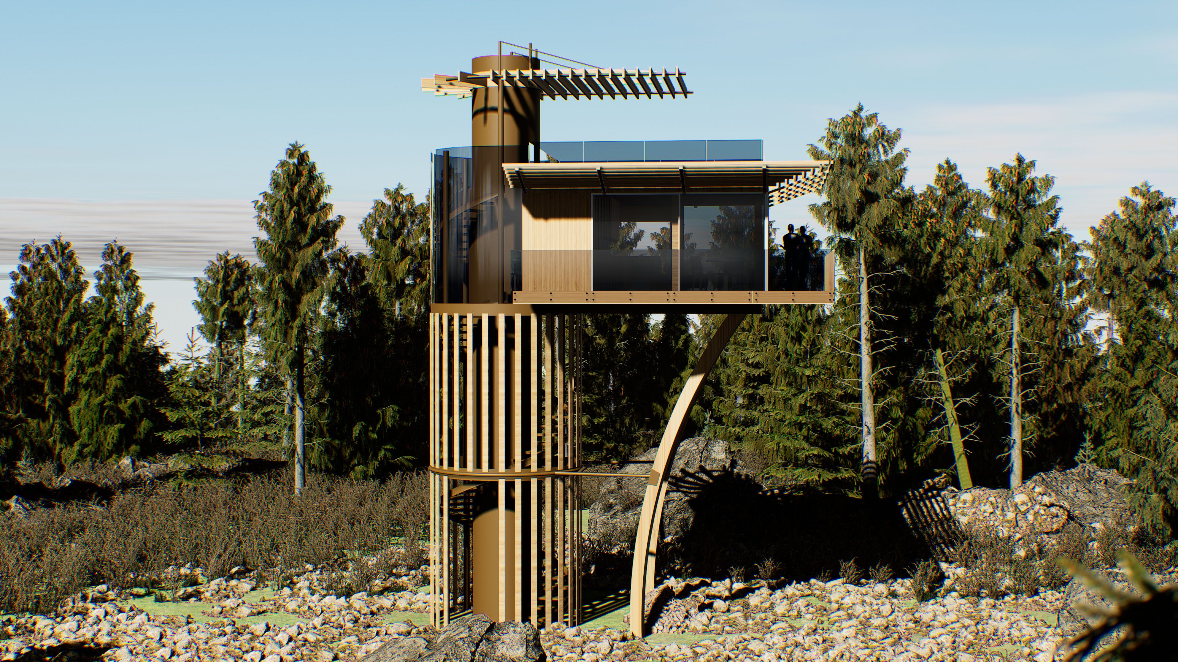 - Inspired by the historic fire towers of the American West — reimagined as a modern, sustainable dwelling that “floats above the trees.”