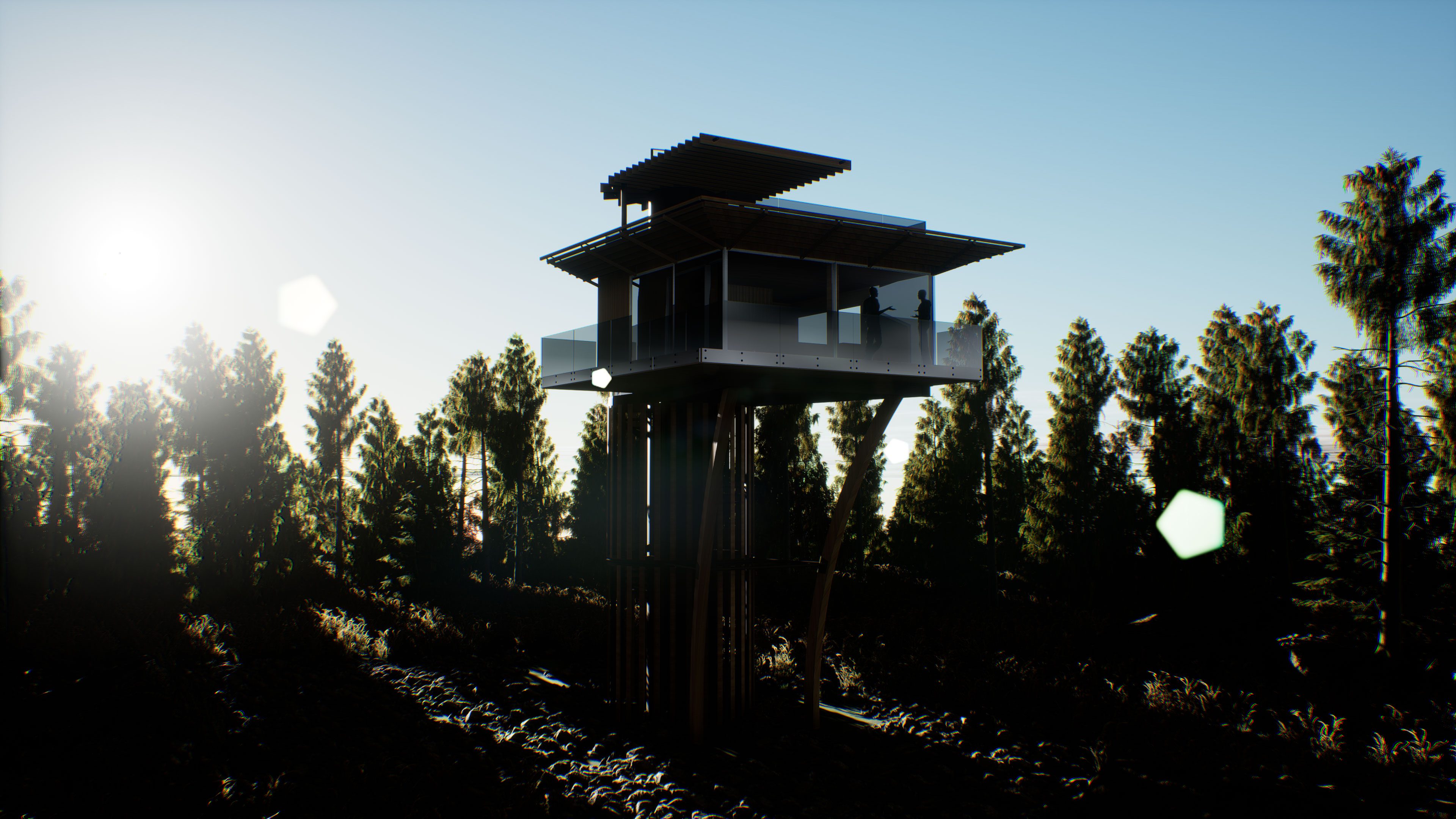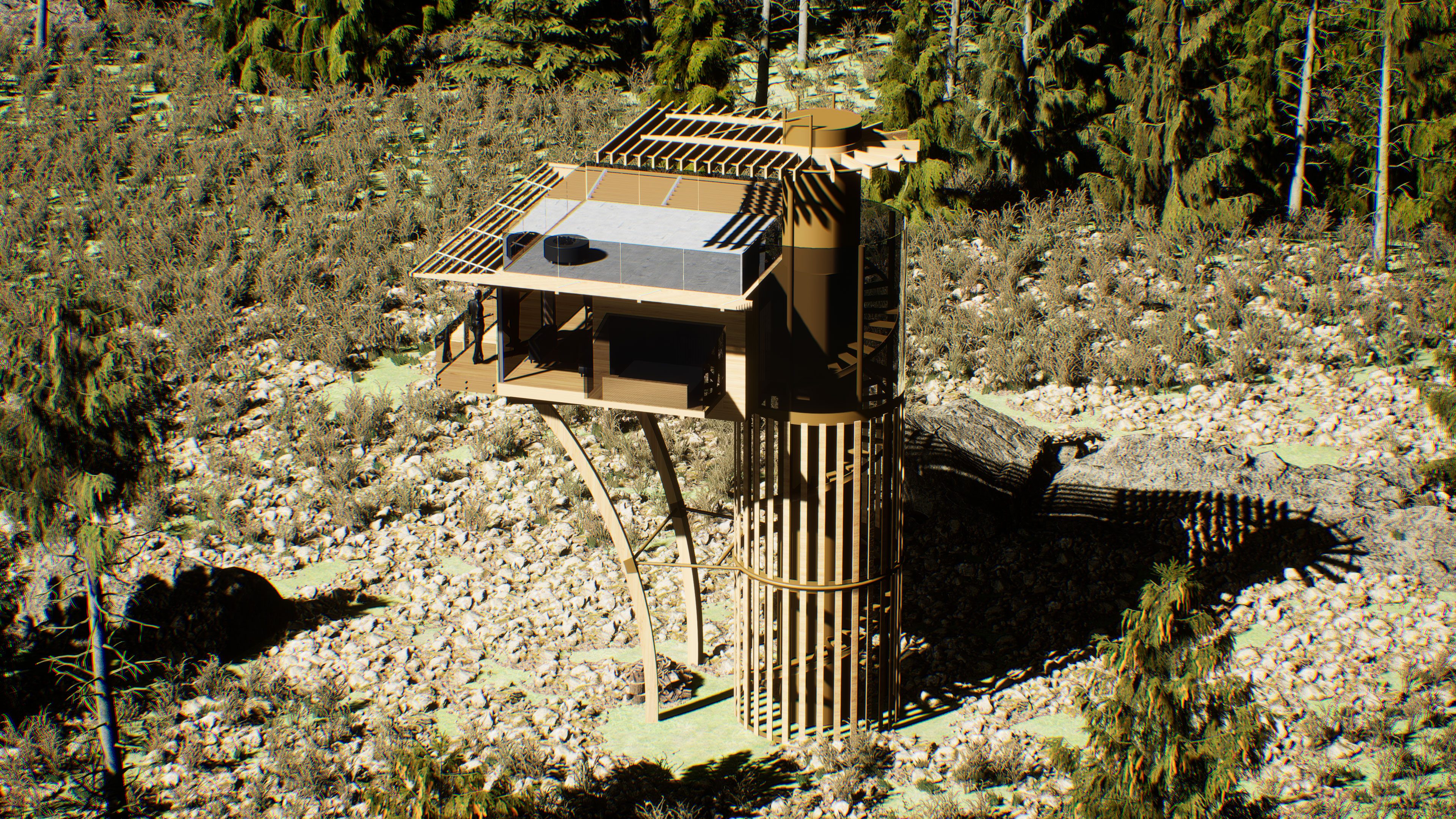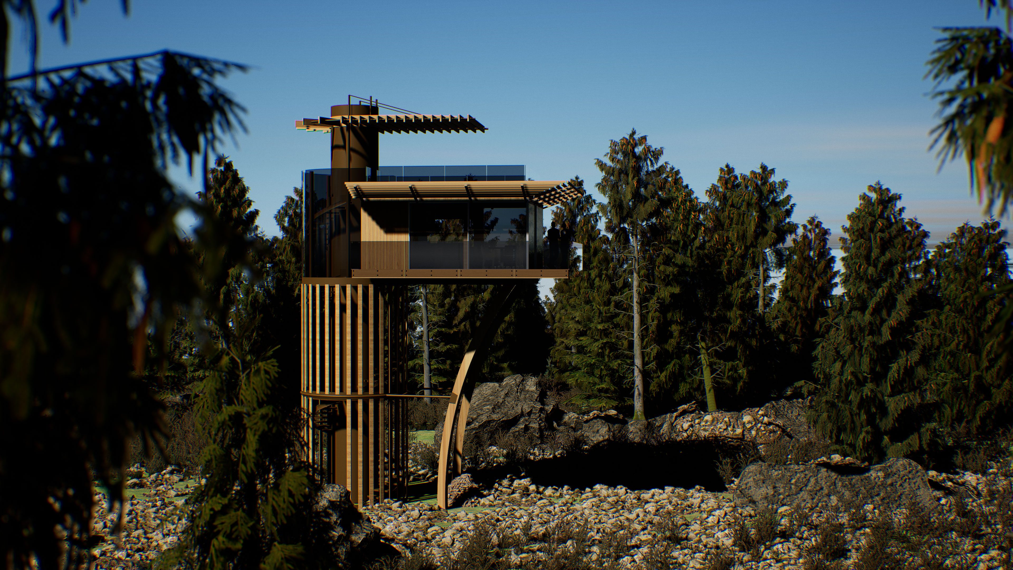 - Inspired by the historic fire towers of the American West — reimagined as a modern, sustainable dwelling that “floats above the trees.”