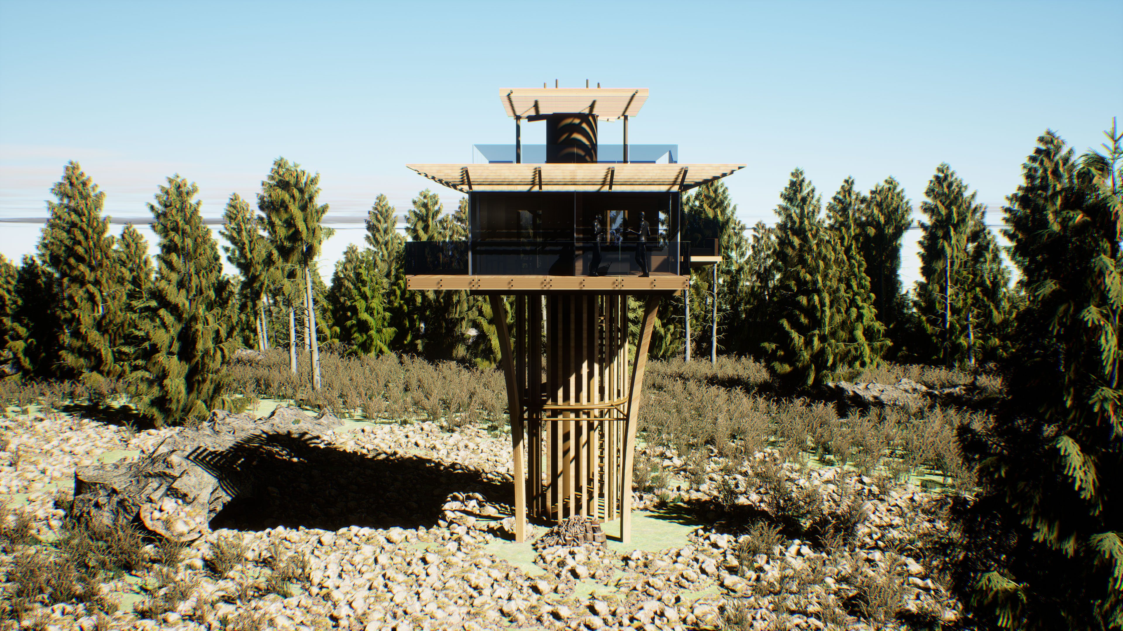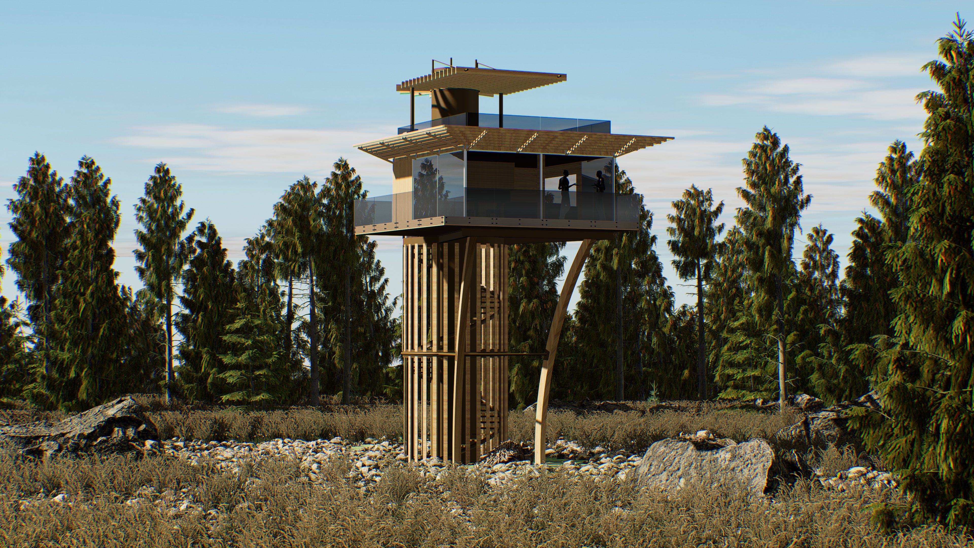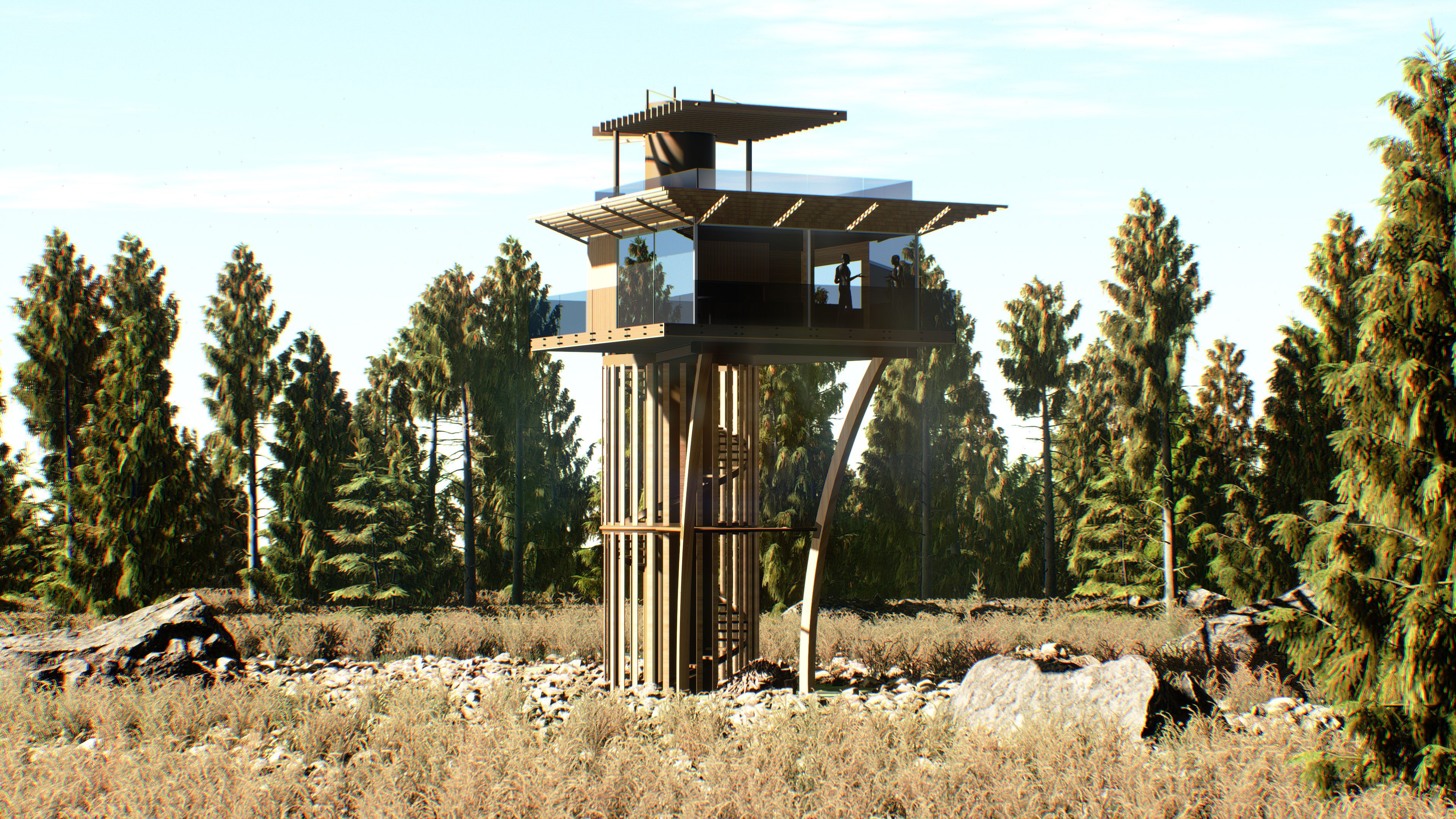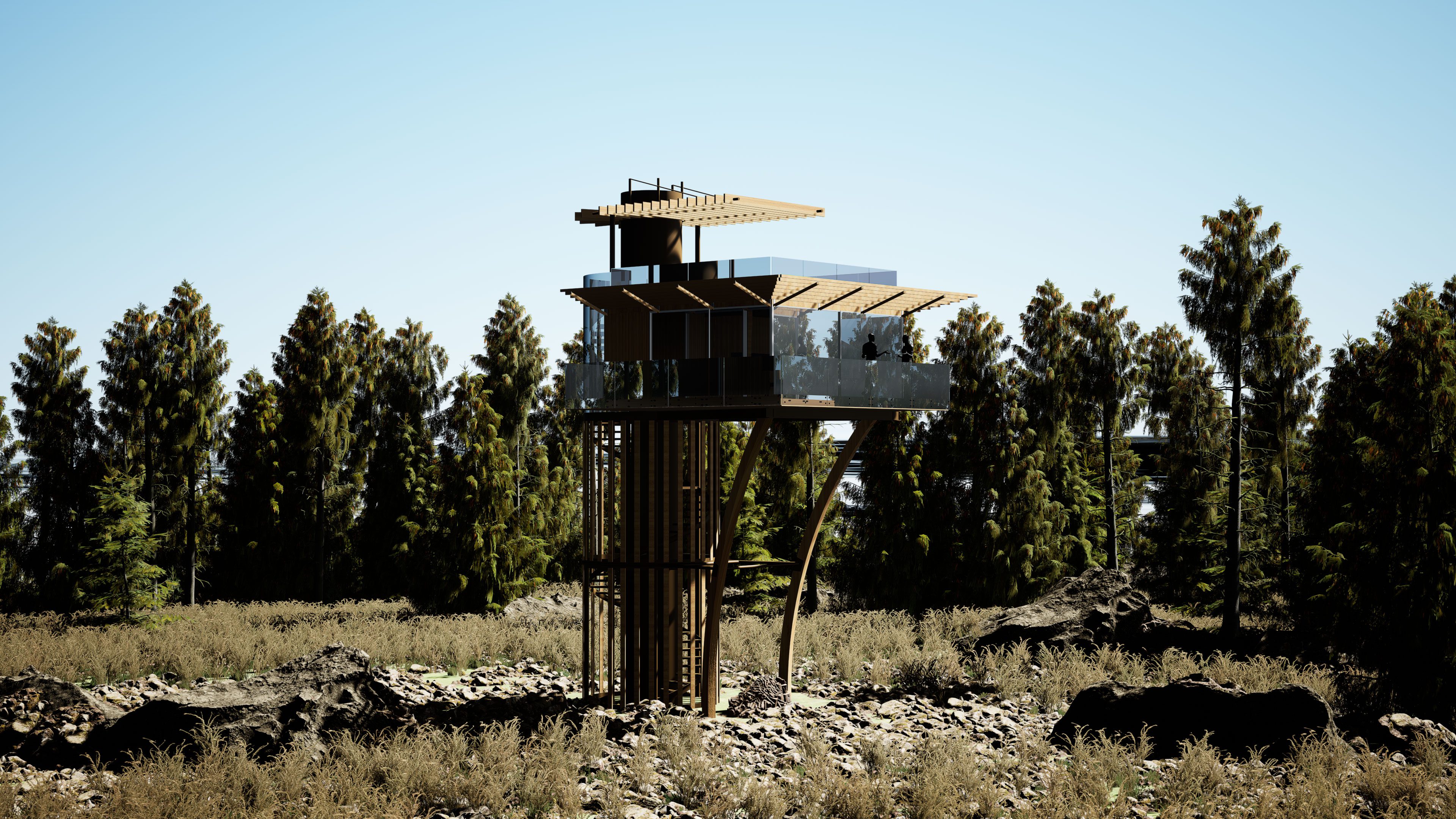 - Inspired by the historic fire towers of the American West — reimagined as a modern, sustainable dwelling that “floats above the trees.”