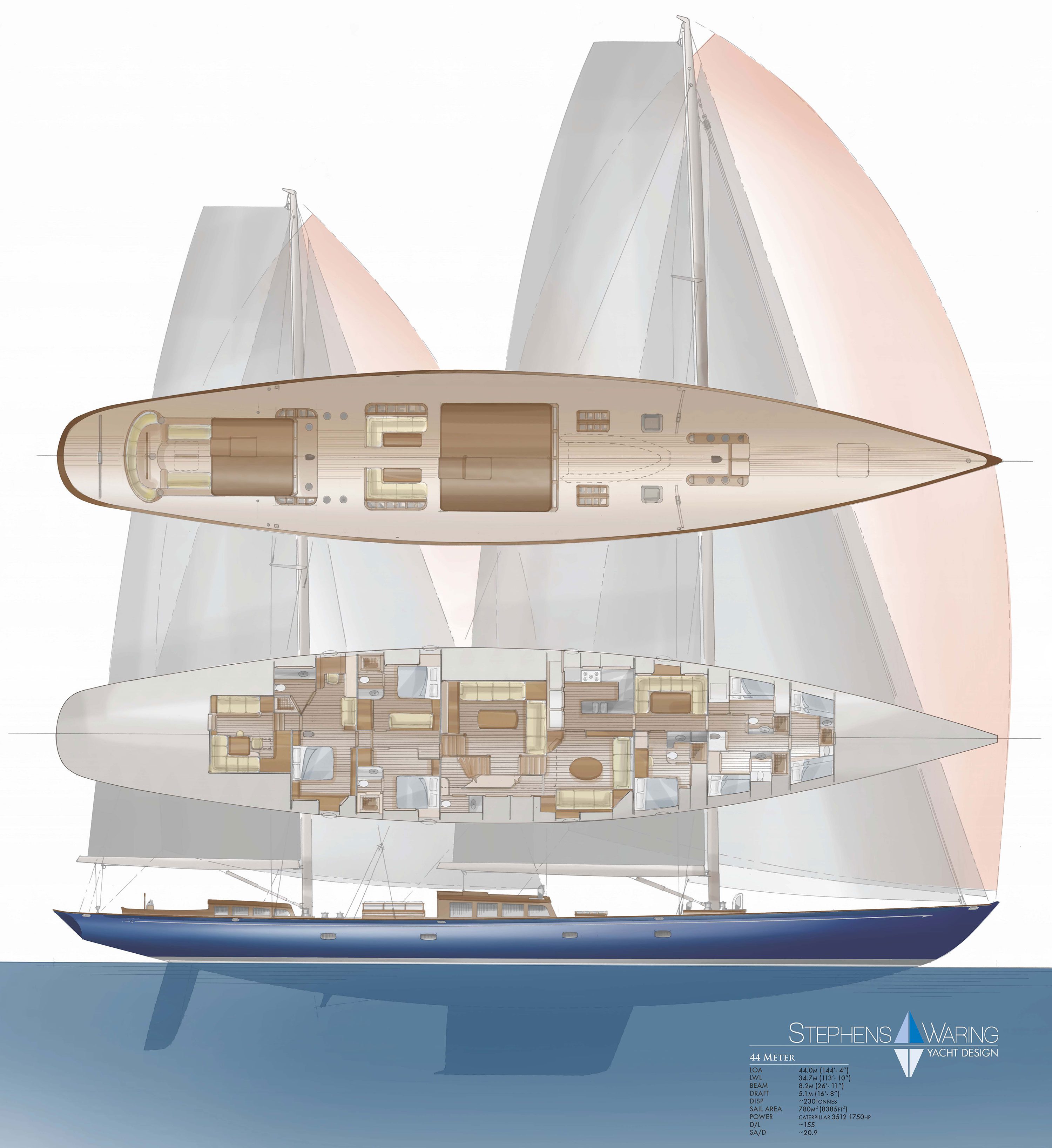 Style, proportion, and spirit of tradition make Anthem a yacht of distinction. She’s designed for extended family cruising or aggressive charter programs supported by a professional crew. At a mere 230 tons, her long overhangs and delicate sheer describe a hull form that could make any predecessor of traditional hand jealous. Anthem will gracefully make her way to any destination without compromising racing performance. She features a seamless blending of indoor and outdoor elements. There are two focal points where interior comfort and outdoor accessibility meet via raised salon seating and cockpit arrangements at mid‐ship and aft locations—each raised salon provides sweeping views under sail or at anchor, a flood of natural light, and wonderful communication with the cockpit. Offshore, the aft salon provides shelter for watch standers and a huge navigation area; inshore, it’s a private aerie for the owner’s stateroom. Down below are three lounge areas in the main accommodation as well as ample space and privacy for the fulltime crew.