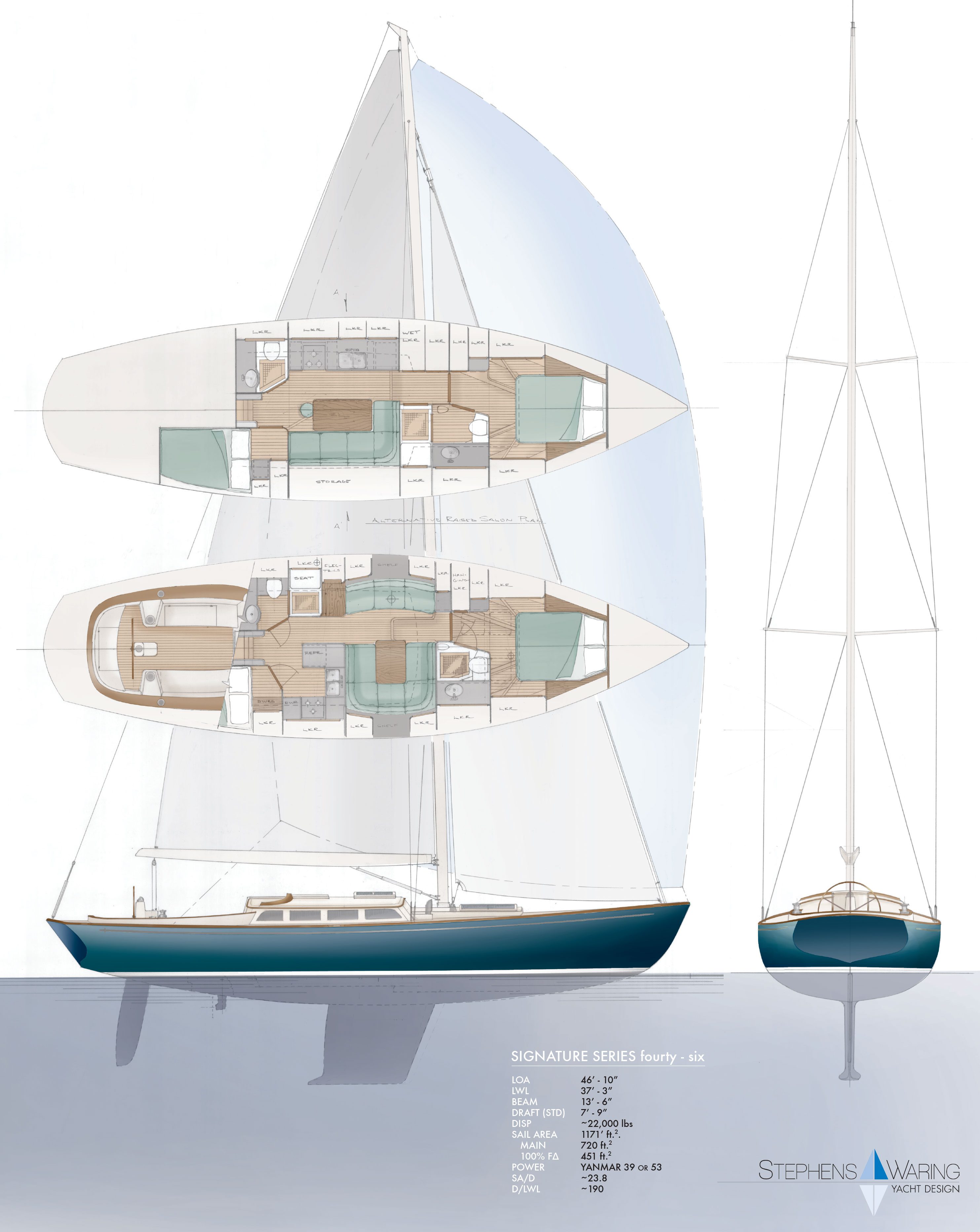 Timeless, classic inspired lines deliver modern sailing experience with striking traditional beauty—the Signature 46 captures the eye and the heart. Her elegant, delicately styled transom balances a tastefully shaped spoon bow. With her light displacement and simple but powerful rig, Signature 46 becomes a handling dream. Her cockpit is set for sailing and lounging with a raised salon interior option to provide panoramic views—underway or at anchor. The Signature 46 also features two well-appointed double staterooms, a generous, state-of-the-art galley and two heads for added comfort and luxury.